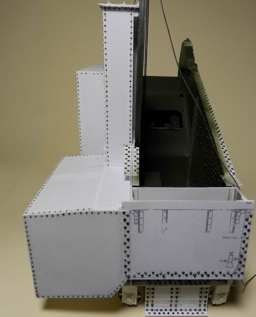 Наконец-то закончил рубки по левому борту. В передней находятся часть механизмов вертикального и горизонтального наведения, рукоять поворотного механизма и два бойца к ней. В средней расположены противовесмы механизма заряжания. В задней нижней, окно для приёма полузарядов и два бойца.Входы в переднюю и заднюю рубки расположены по центру.