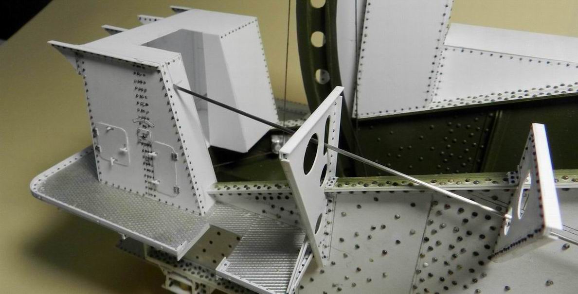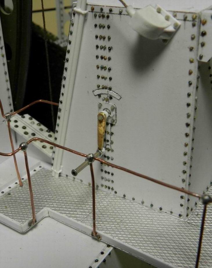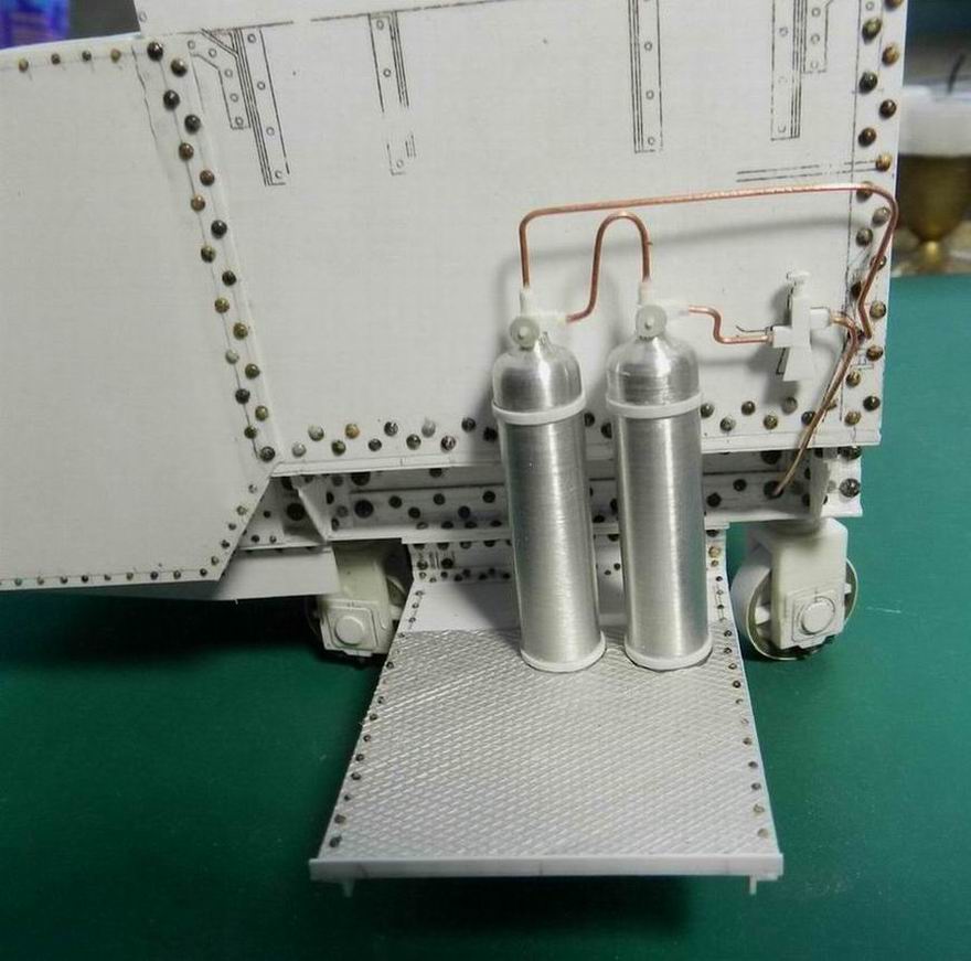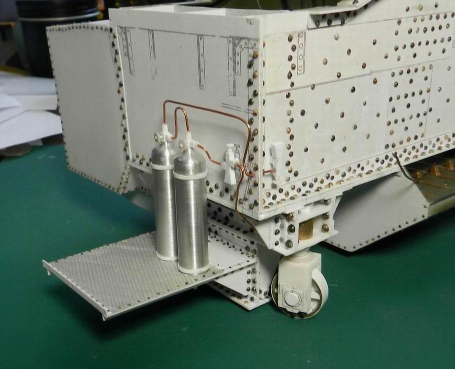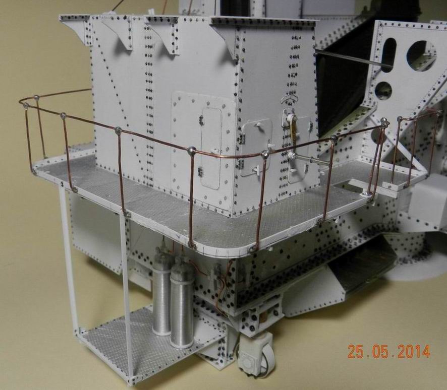 Продолжаю нанизывать детали на журавль. Выточил баллоны (назначениеи их мне не удалось выяснить), сделал площадку под них и установил сзади. Провёл трубопроводы от них. Кроме того при внимательном рассмотрении имеющихся фотографий понял, что не сделал поддерживающие кронштейны рубок. Сделал и их.