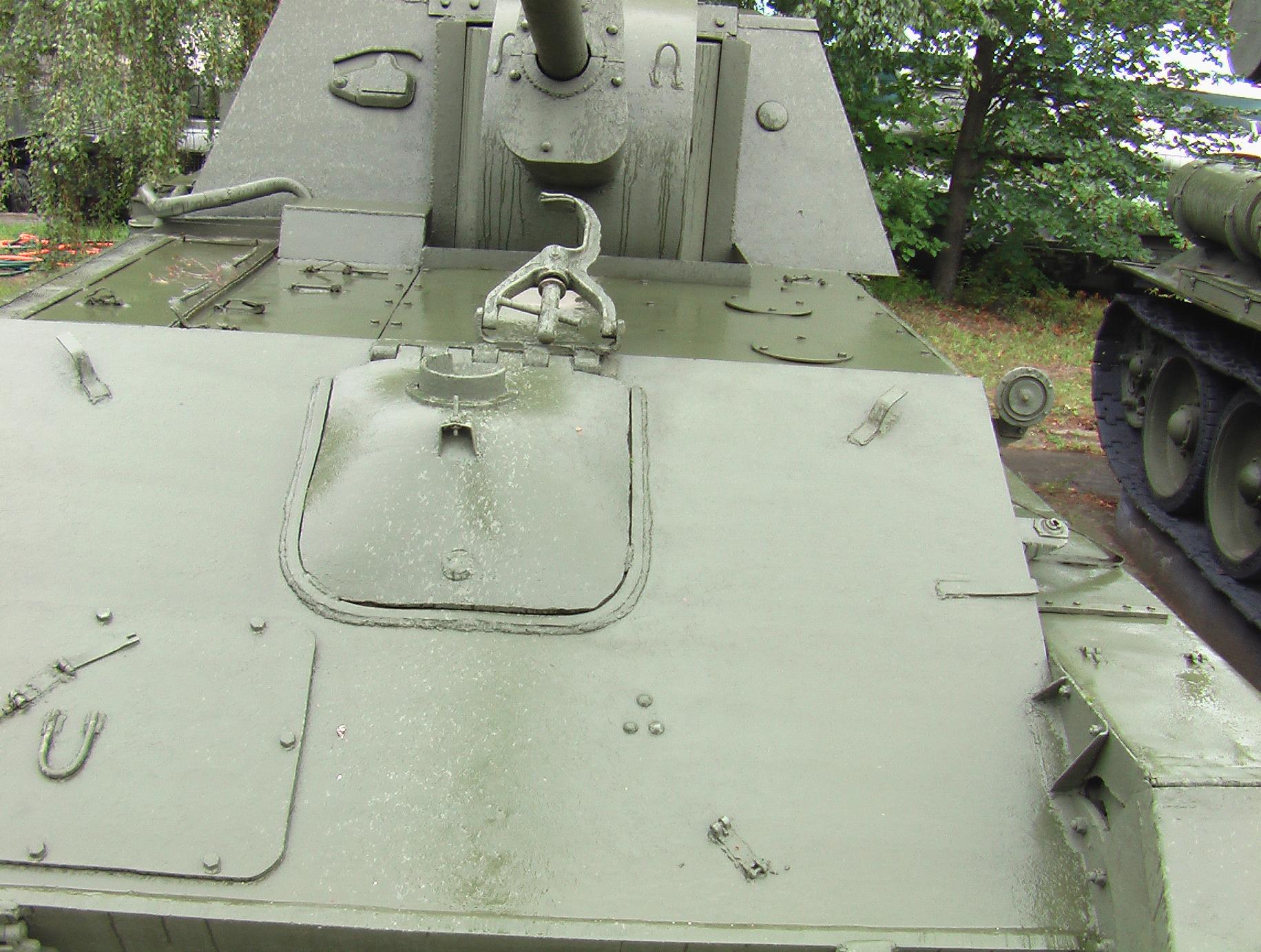 Национальный военный музей, Бухарест, Румыния.На этой машине видно, что поддерживающие угольники крепятся к машине сваркой а к полке - на 4(четыре)болта и болты берутся по парно,причем центр угольника получается разряженным.Чего не скажешь о "косынке",полка к косынке крепится уже на 5(пять)болтов,которые равноудаленны друг от друга.А сама "косынка" уже крепитя к самоходу не сваркой,а под болт.То что плки наборные на этой машине я не вижу.
