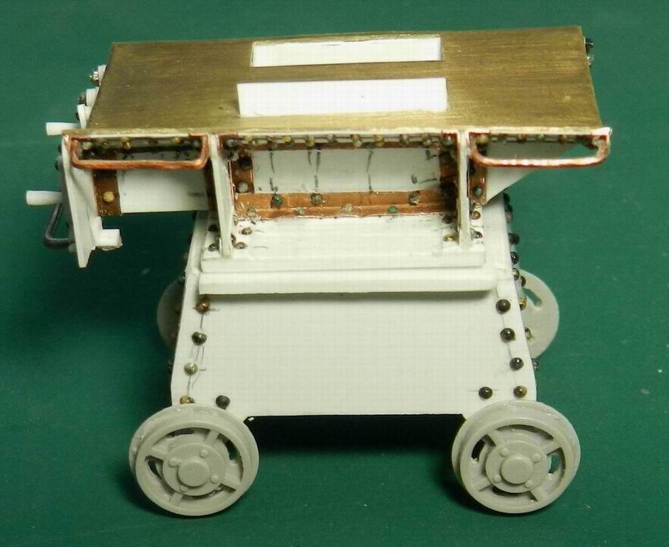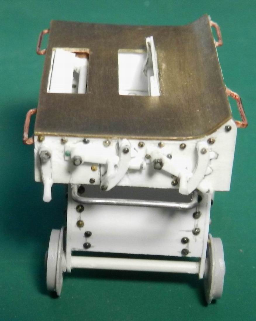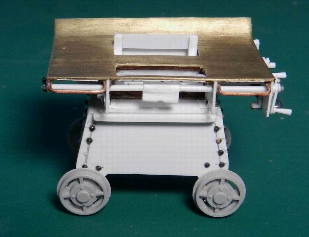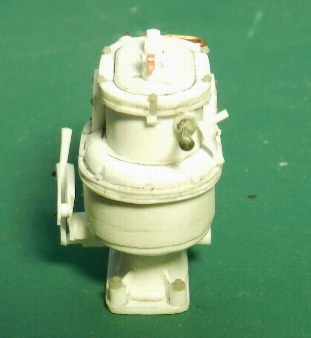 Наконец разродился следующими деталями по модели 305 мм. орудия. Изготовил две рубки для постов горизотального и вертикального наведения. Кроме того сделал рубку для поста управления огнём с площадкй. А также правую верхнюю площадку. Временно установил всё на журавль. Клеить буду после изготовления приборов и покраски нижней части.