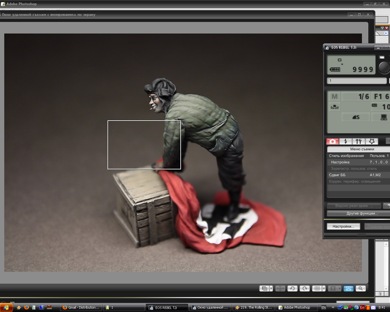 Очень нравится что во время съемки можно сразу просматривать изображение во весь экран и случайная маленькая, но ярко-белая пылинка на фигурке будет вовремя замечена не испортит фотографию. Фокусироваться вручную по экрану монитора тоже удобно, чему помогает и широкое удобное кольцо фокусировки объектива. А вот ход кольца фокусировки мог бы быть и по-больше, но всё-таки моя Сигма штатный зум с макровозможностями, а не полноценный макрообъектив. Самые ходовые фокусные расстояния для макросъемки одиночной фигурки 50-70 мм.