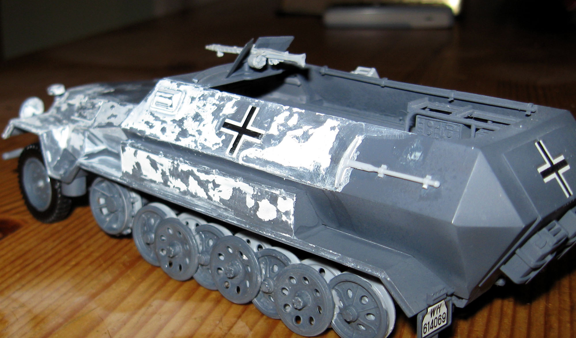 3.Как краска слегка подсохла обкалупываешь хаотично (но с присутствием логики - там где больше вероятность обдирания камка- гдеступала нога солдата, ветка дерева царапала,болтающийся трак протер и тд.)