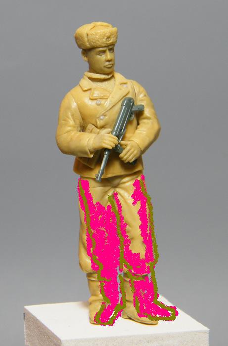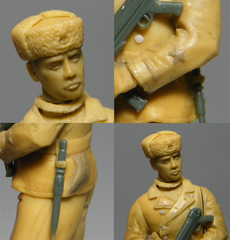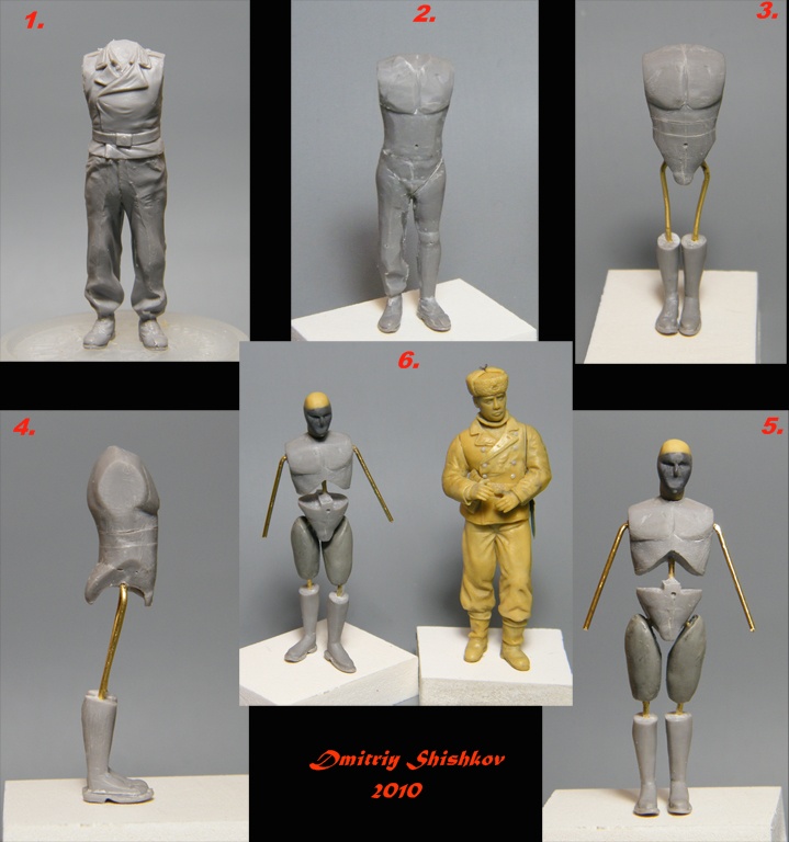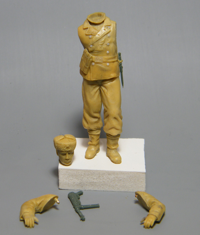 Александр Зеленков, почленил,т.к. мне так удобней было лепить,ну и для дальнейшей окраски будет удобней.Голова отдельно,т.к. шея входит в горло свитера и в последущем аккуратная покраска была бы затруднительна, если бы голова была монолитна с телом.Про автомат-боец его не держит а положил руки на него,автомат будет с ремнём перекинутым через торс.