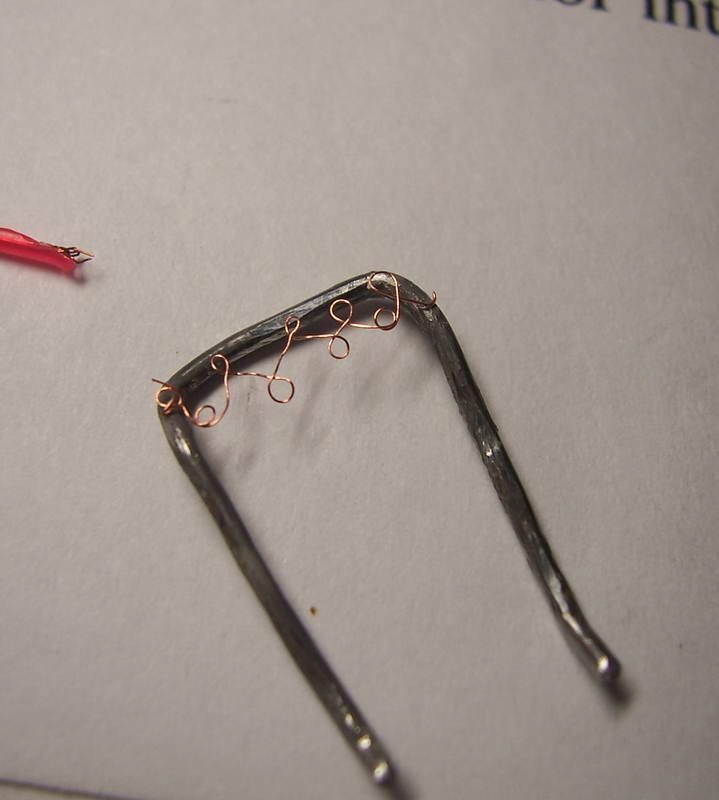 Там на нужном расстоянии, повторяя узор дырок в проволоке, втыкаются в пластилин (у Пэйна в деревянную болванку) зубочистки/колышки/металлические штырьки/мелкие гвозди (нужное подчеркнуть! хехе) и вокруг них сразу формируется вся(!) оплетка. Очень удобно и быстро!