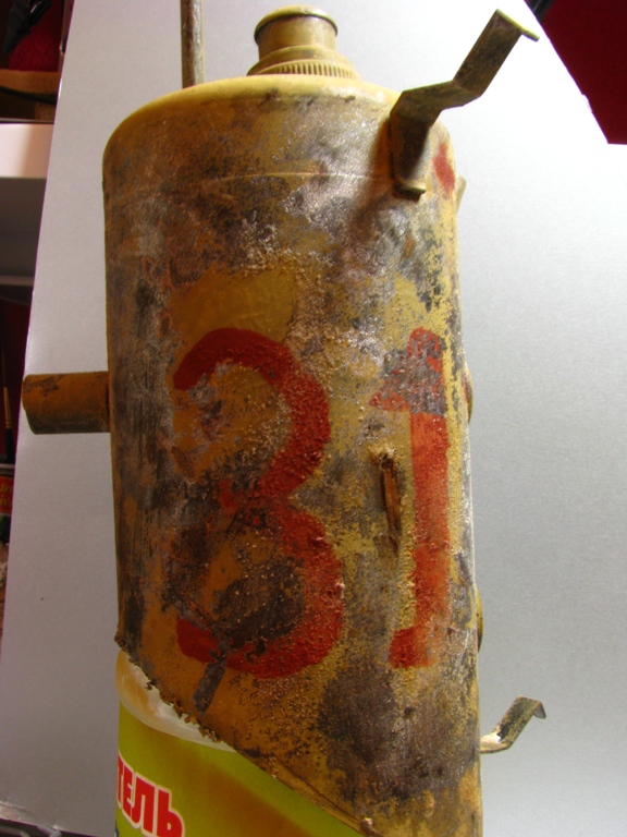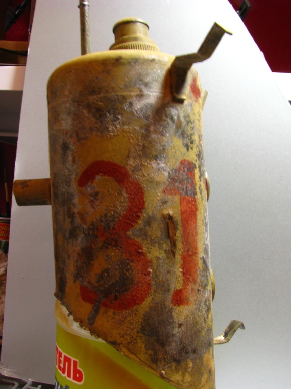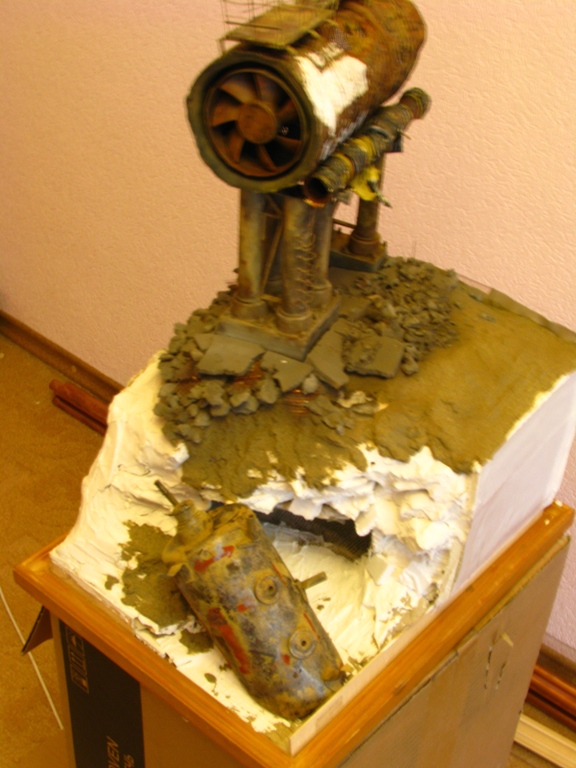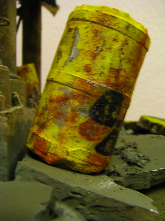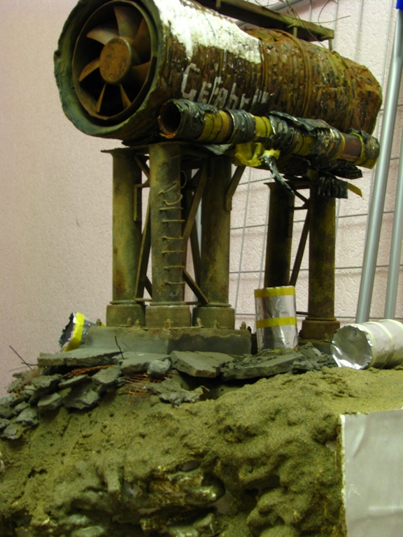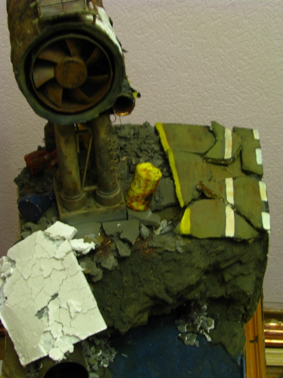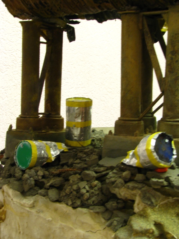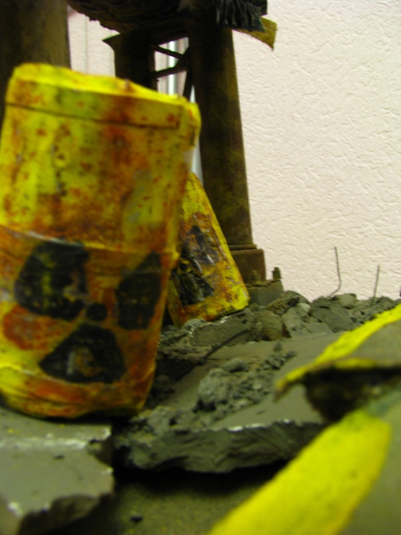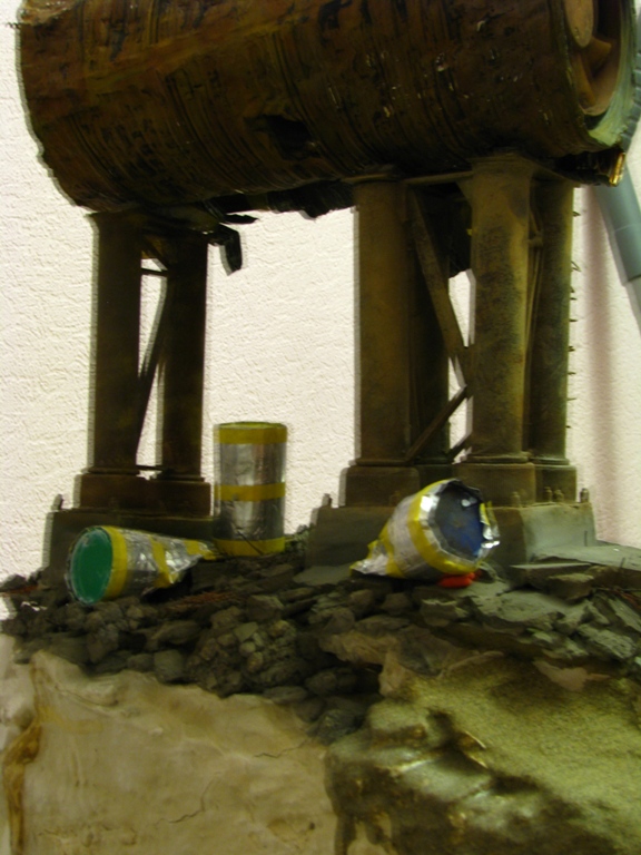 итак, сделал дополнительную трубу- баллончик из-под крема для бритья. бочки самодельные. асфальт- наждачка нулевка на пенопласте. часть бетонной плиты неокрашенная пусть сохнет.