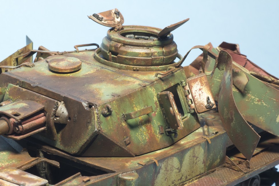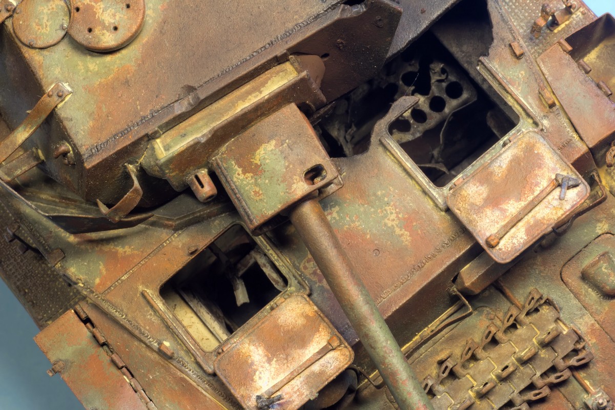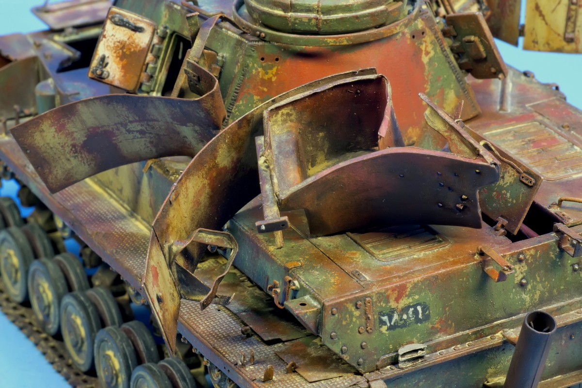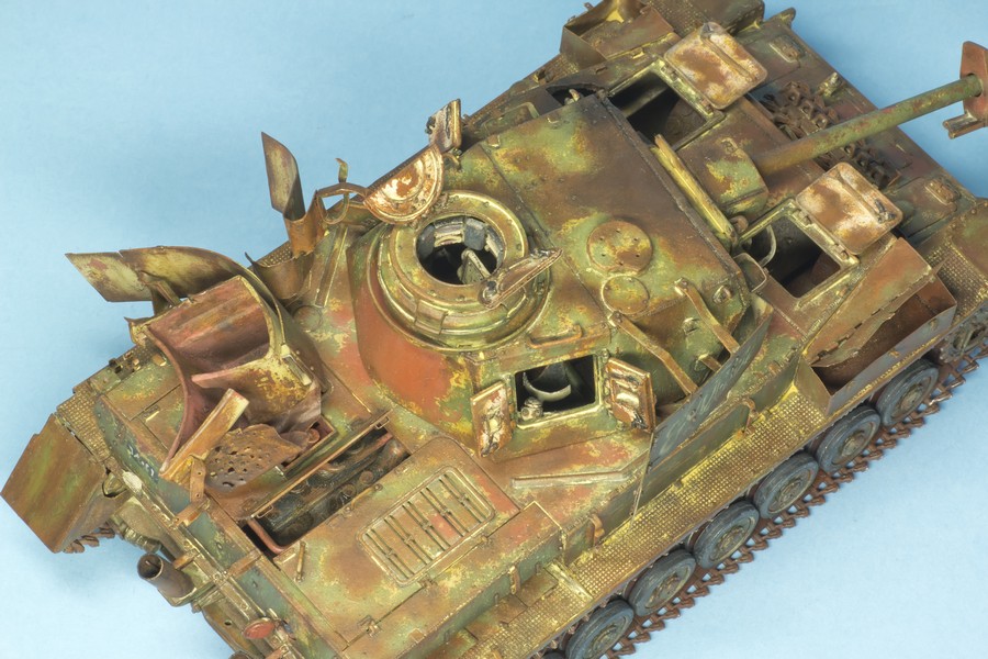По крупному, закончил "ржавление" корпуса и башни. Использовались масла и жидкости от MIG и AK. пространство под полками дополнительно затемнил тамиевским Smoke.