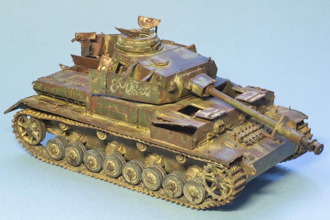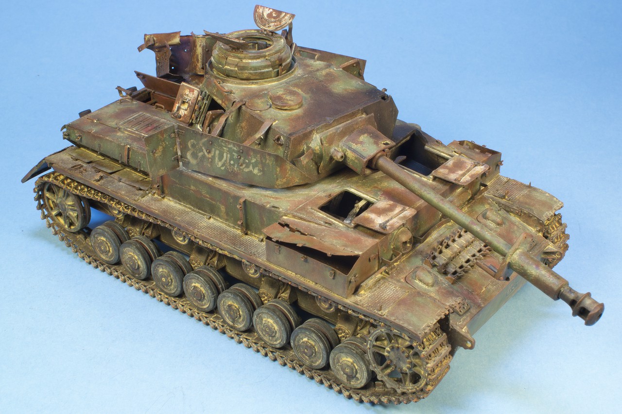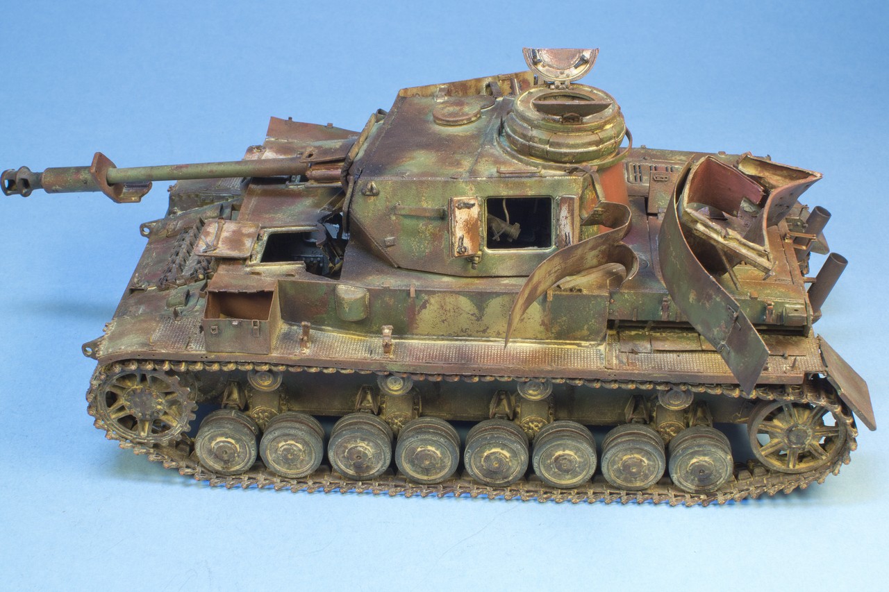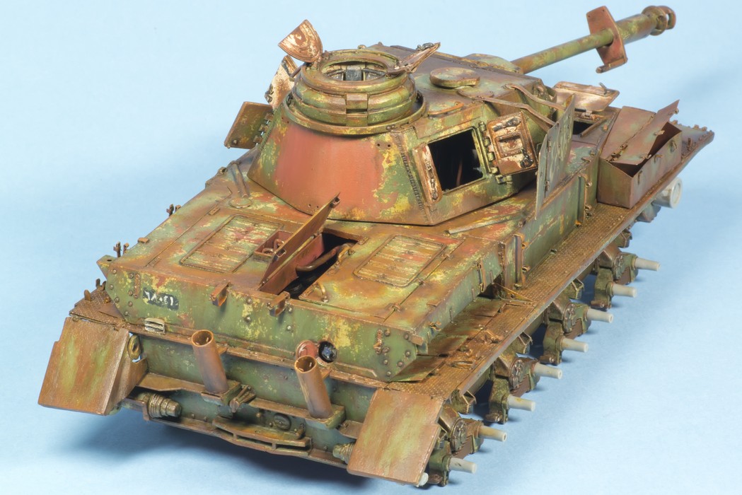 По крупному, закончил "ржавление" корпуса и башни. Использовались масла и жидкости от MIG и AK. пространство под полками дополнительно затемнил тамиевским Smoke.