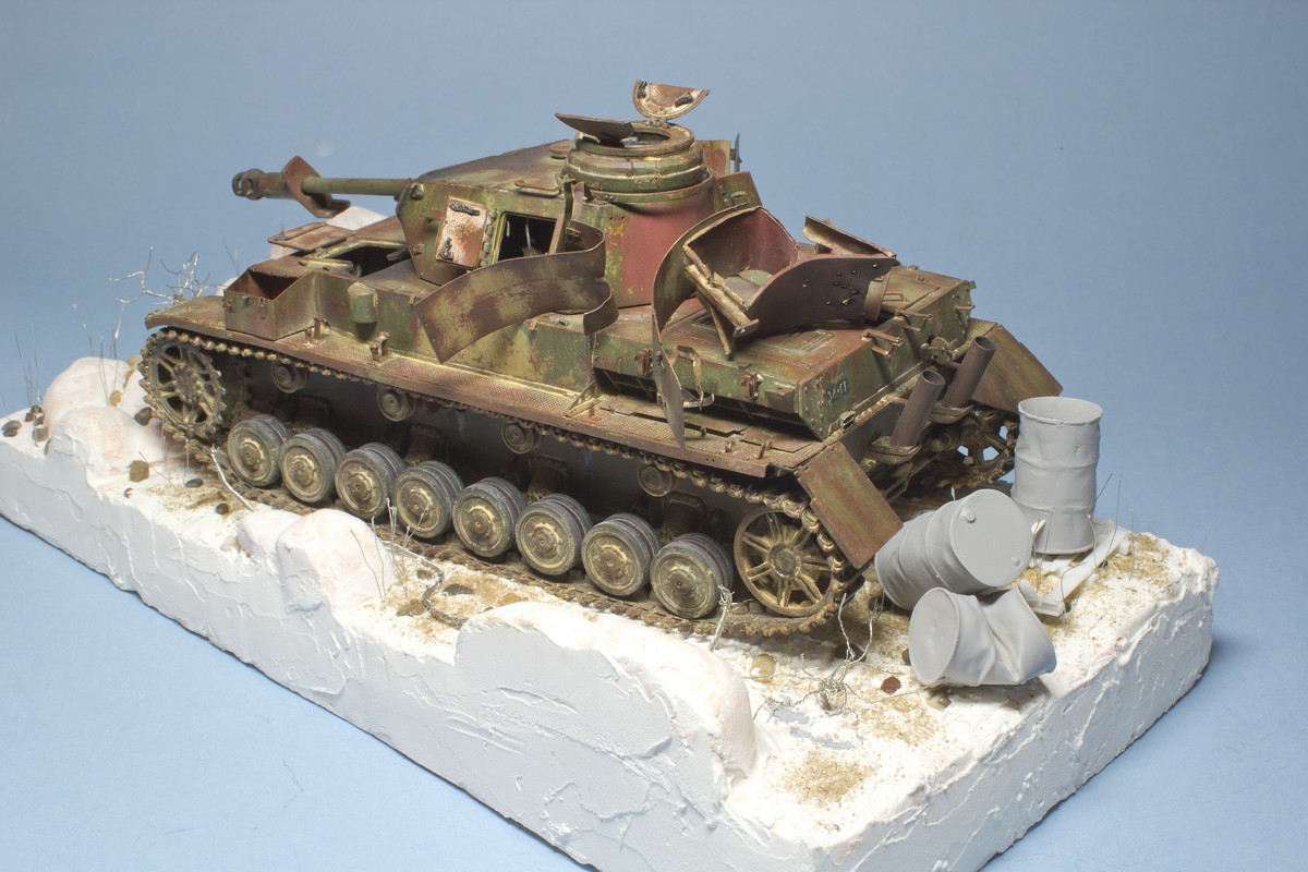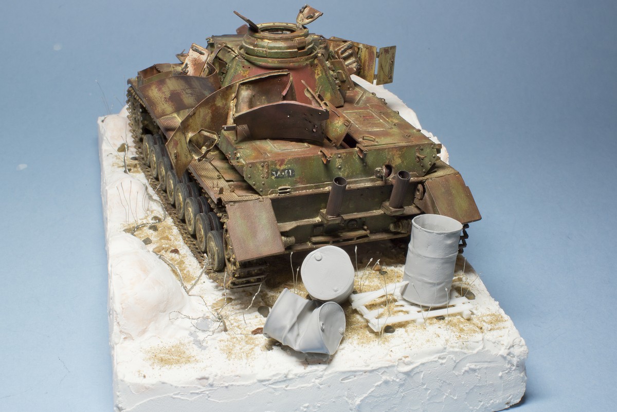 Подставку буду делать под форм-фактор тамиевско футляра. Планирую участие камней, песка, кустиков, травы, колючей проволоки и всякого хлама (бочки, гильзы, разбытые ящики). Цель - показать брошенную позицию брошенного танка.
