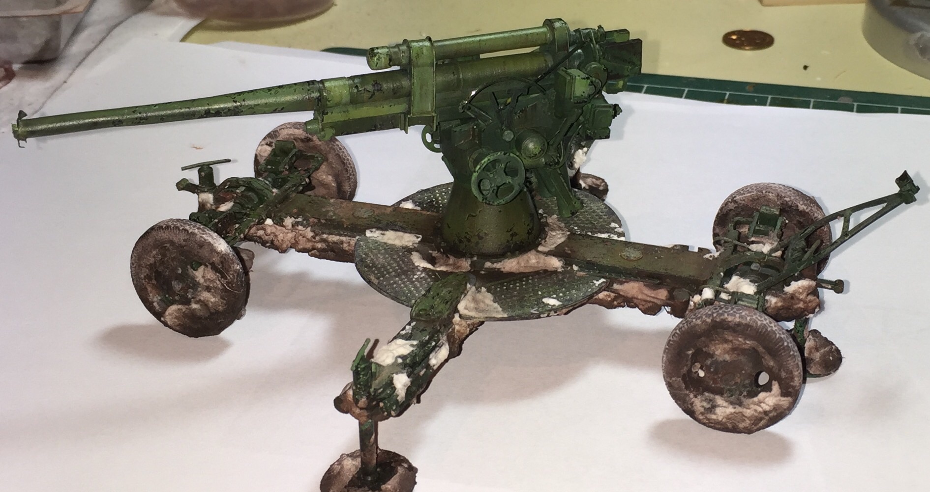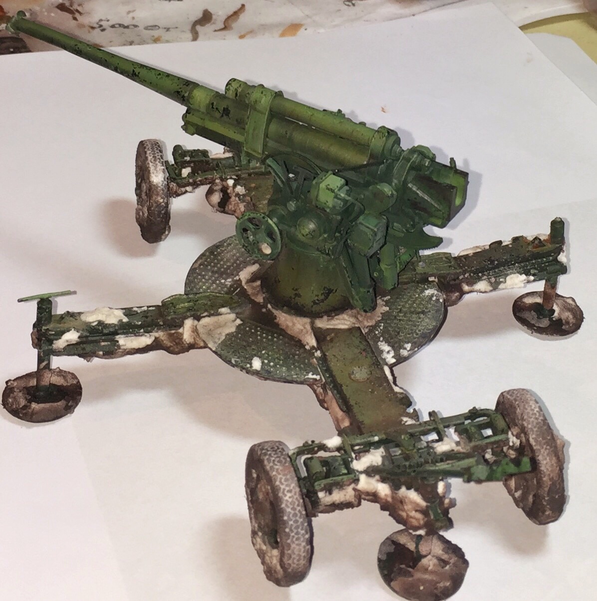 Хочу сделать следующим образом- смывку чем то по темнее, дабы подчекнуть мокрую грязь,особенно на колеса, нанести немного снега по всей зенитке. Хотел сделать сосульки из тянутых прозрачных литников, но пушка же стреляла, думаю сосульки не удержались бы от сотрясения орудия.. Добавлю еще немного грязевых потеков на само орудие, мне кажется слишком уж чистое получилось!