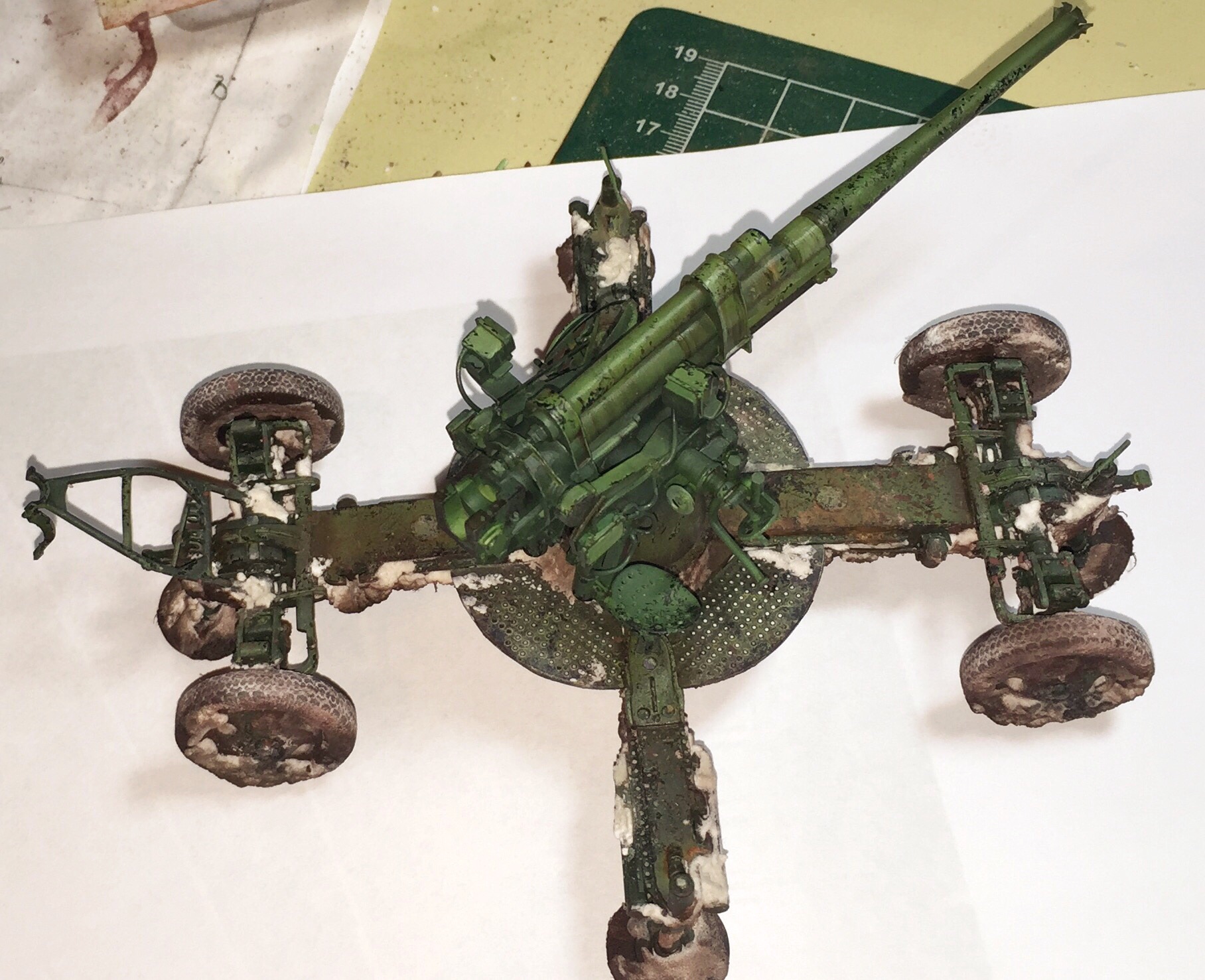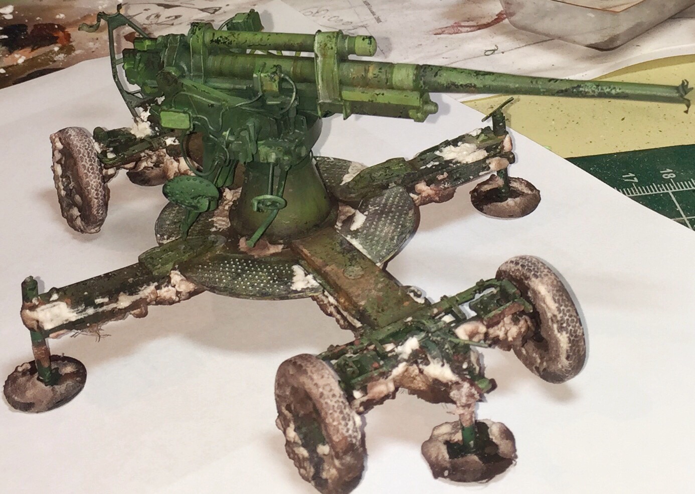 Классная зенитка. Всё понравилось, только цвет смутил. Не слишком яркий с уходом в зелень? И подкоптить след от пороховых газов на казённике бы.