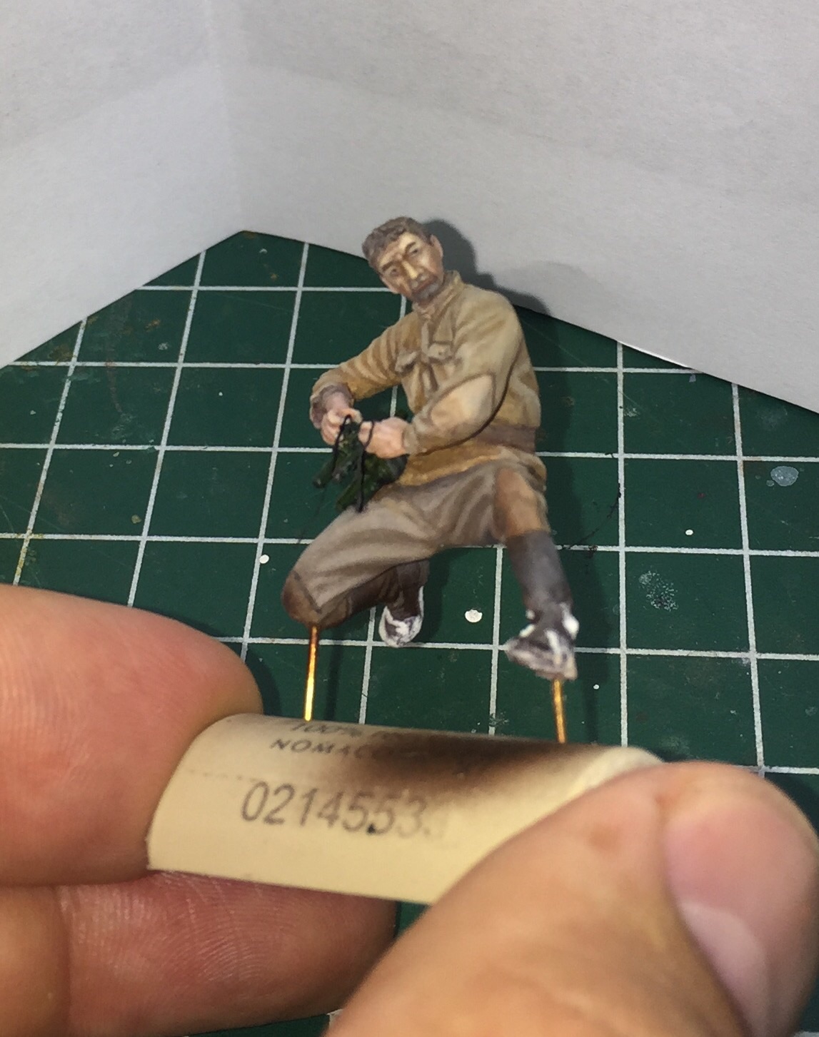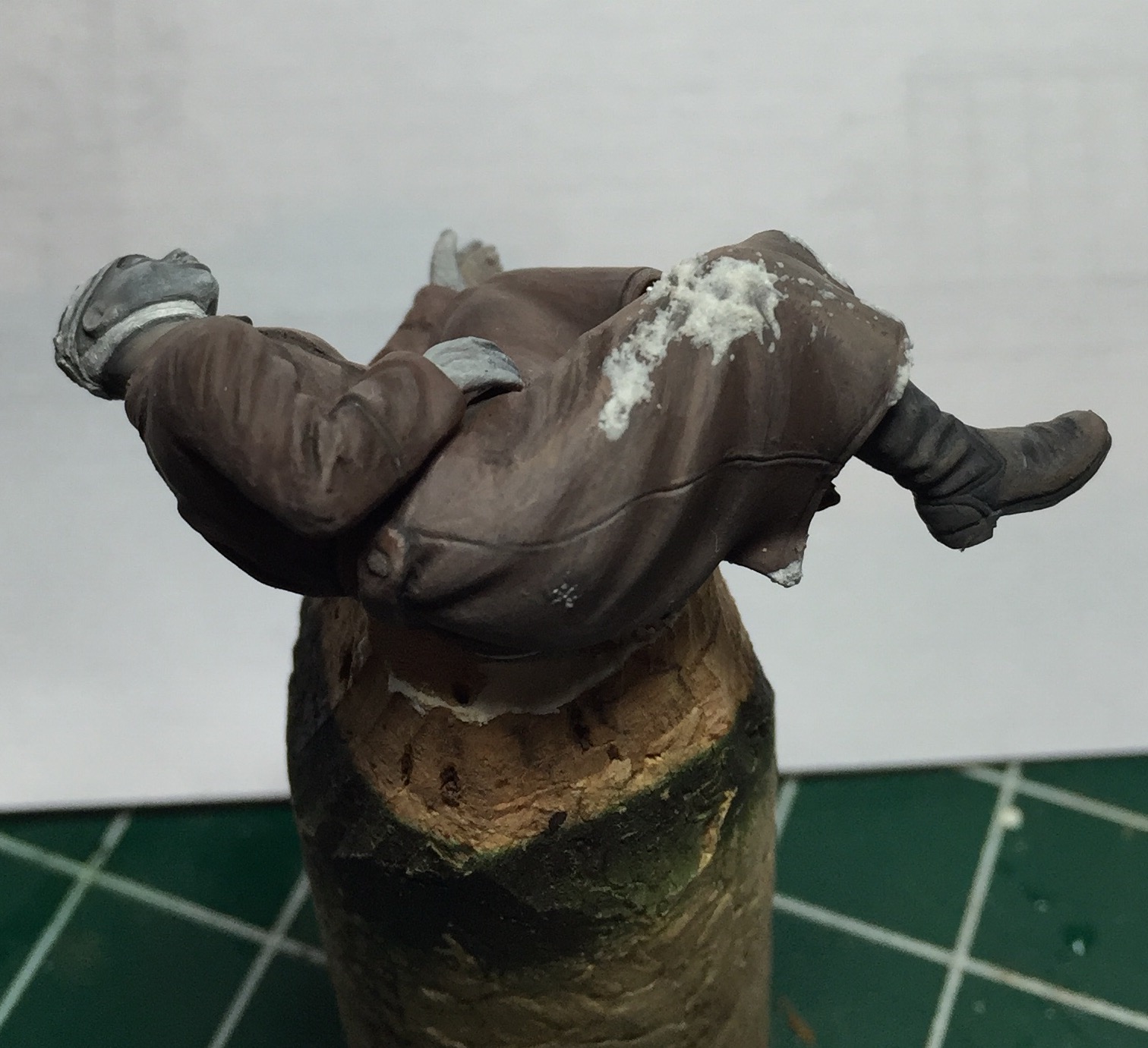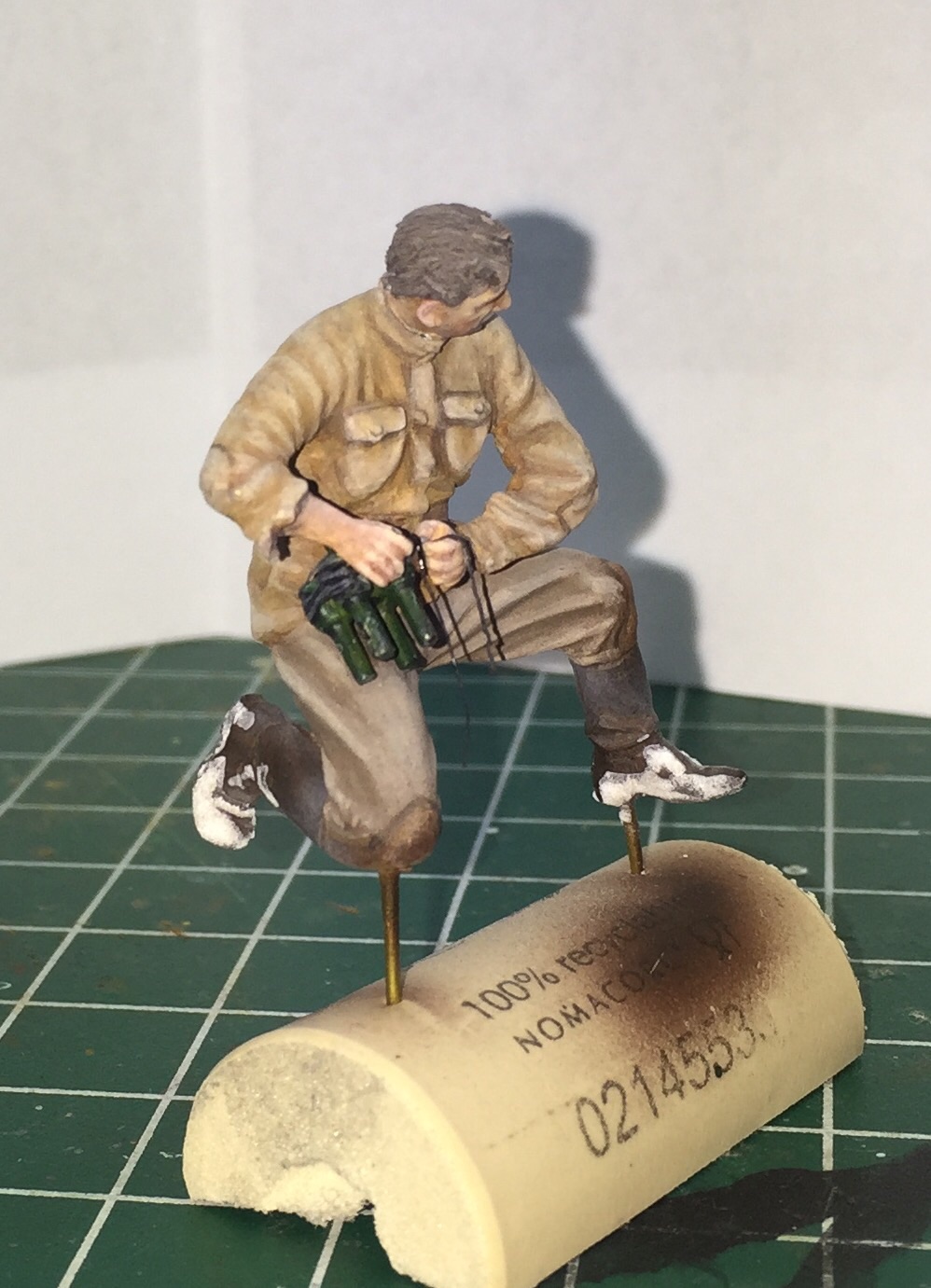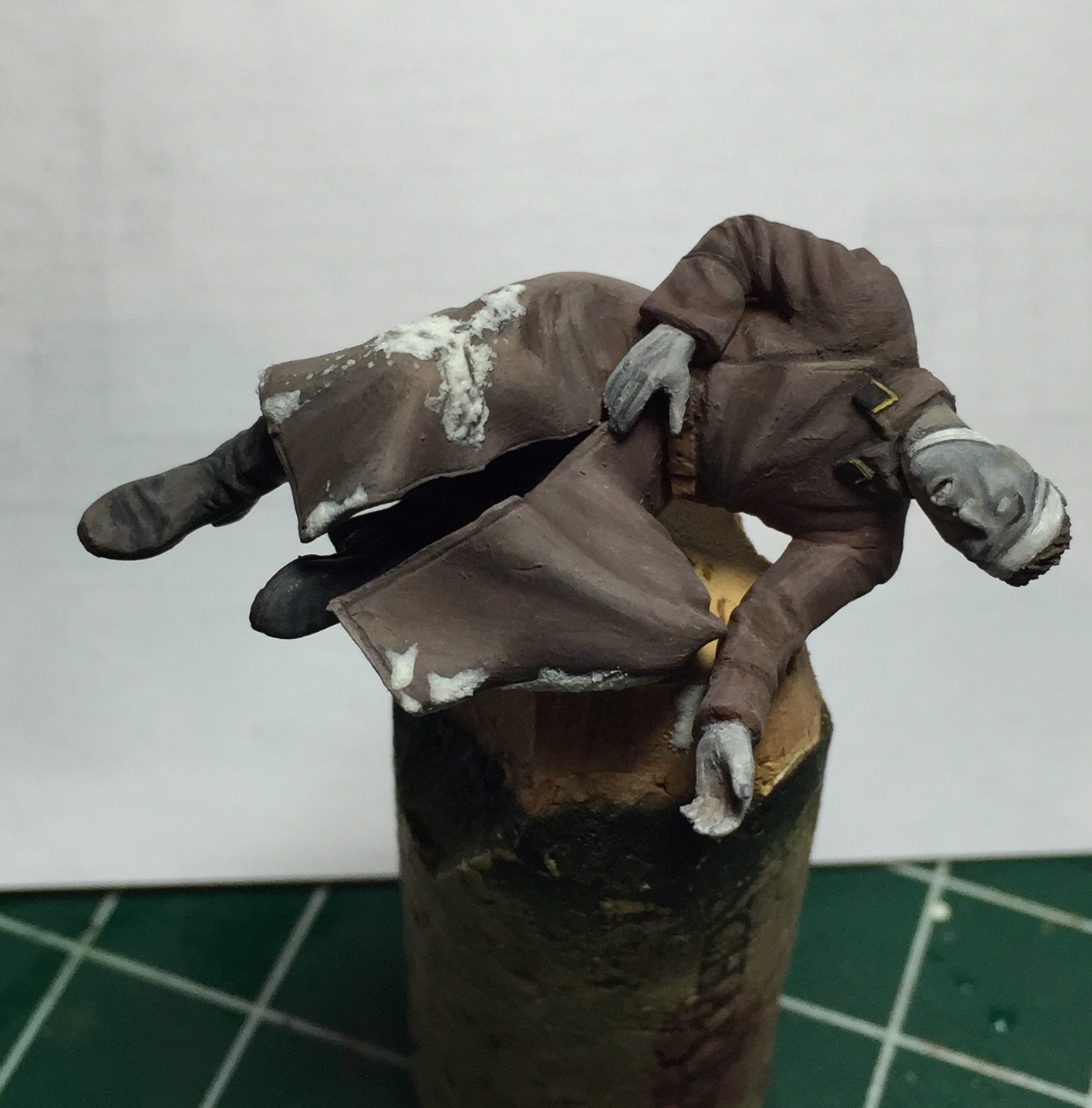 Очень долго не принимался за этого бойца.. Да и за само хобби в целом. Итак, убитый подносчик снарядов. Не самая приятная фигурка для росписи, но ничего не поделаешь- по задумке у меня будет два убитых на диораме- как и на картине. Может показаться что цвет лица слишком синий, но сцена же на снегу, прикинул, что так может быть от мороза..
