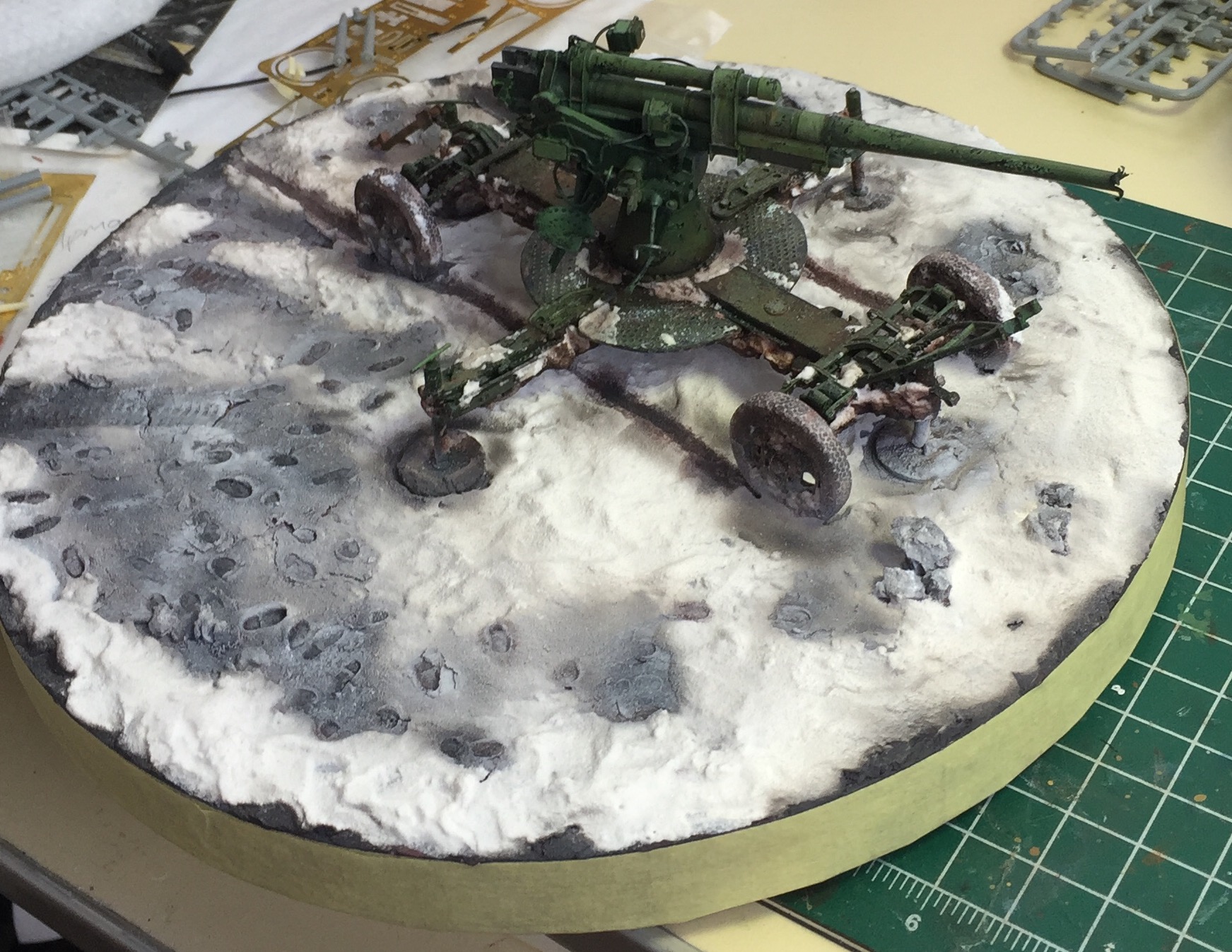 После продолжительного перерыва, продолжаю любимое дело.. Основание подобрал в магазине для хобби и разных поделок, ничего необычного- круглая основа.. Обмазал затвердивающей на воздухе глиной, сразу же наметил место для зенитки, вдавил ее чуть чуть в незастывшее основание. Потом задул коричневым, потом черным из аэра, попытался сделать некое подобие цветов земли, которая будет проступать у меня из под снега.. Дальше классическая смесь- сода, ПВА, белая гуаш, немного воды.. Уже по нанесенной смеси на основание, сверху посыпал содой.. Пока не высохла! Потом немного задул жидко разведенной темно серой красклй.. Как мне показалось- передает атмосферу.. Следующий этап- размещение фигурок, ящиков из под снарядов, гильз, думаю сделаю еще кустик небольшой, слева, спереди от зенитки..