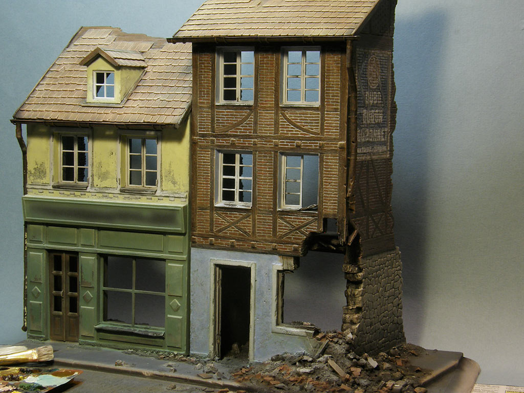 Привет. Я всё с архитектурой страдаю... все таки 2 дома, это не танк... объемы утомляют. Пока нанесен базовый слой покраски, немного ободрал и загрязнил. Впереди фильтры, смывки, потеки прочее. Трубы, желоба, дорогу и тротуар еще не красил.