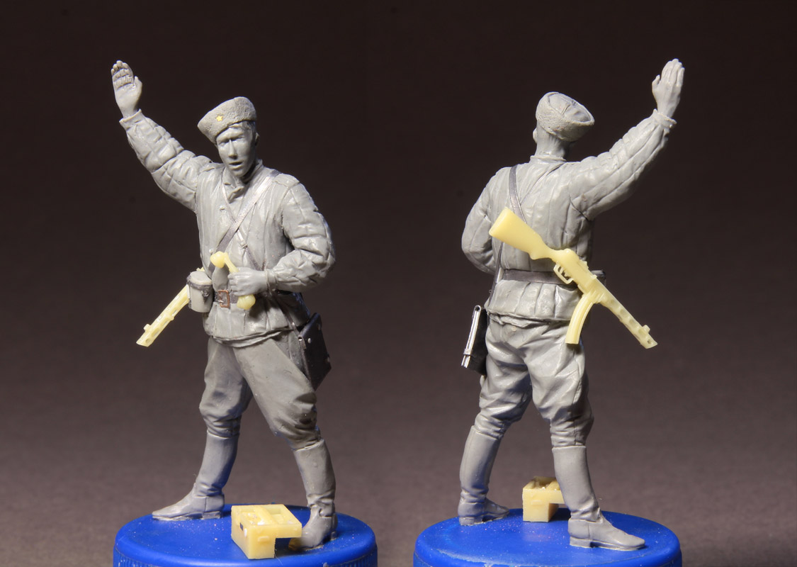 и командир будут идти отдельными фигурками. У командира телефон УНА-Ф-42, типа он огонь с корректировкой ведет, но кроме этого у фигурки будут дополнительные кисти рук с сигнальным пистолетом в правой и биноклем в левой руке и дополнительная голова в фуражке.