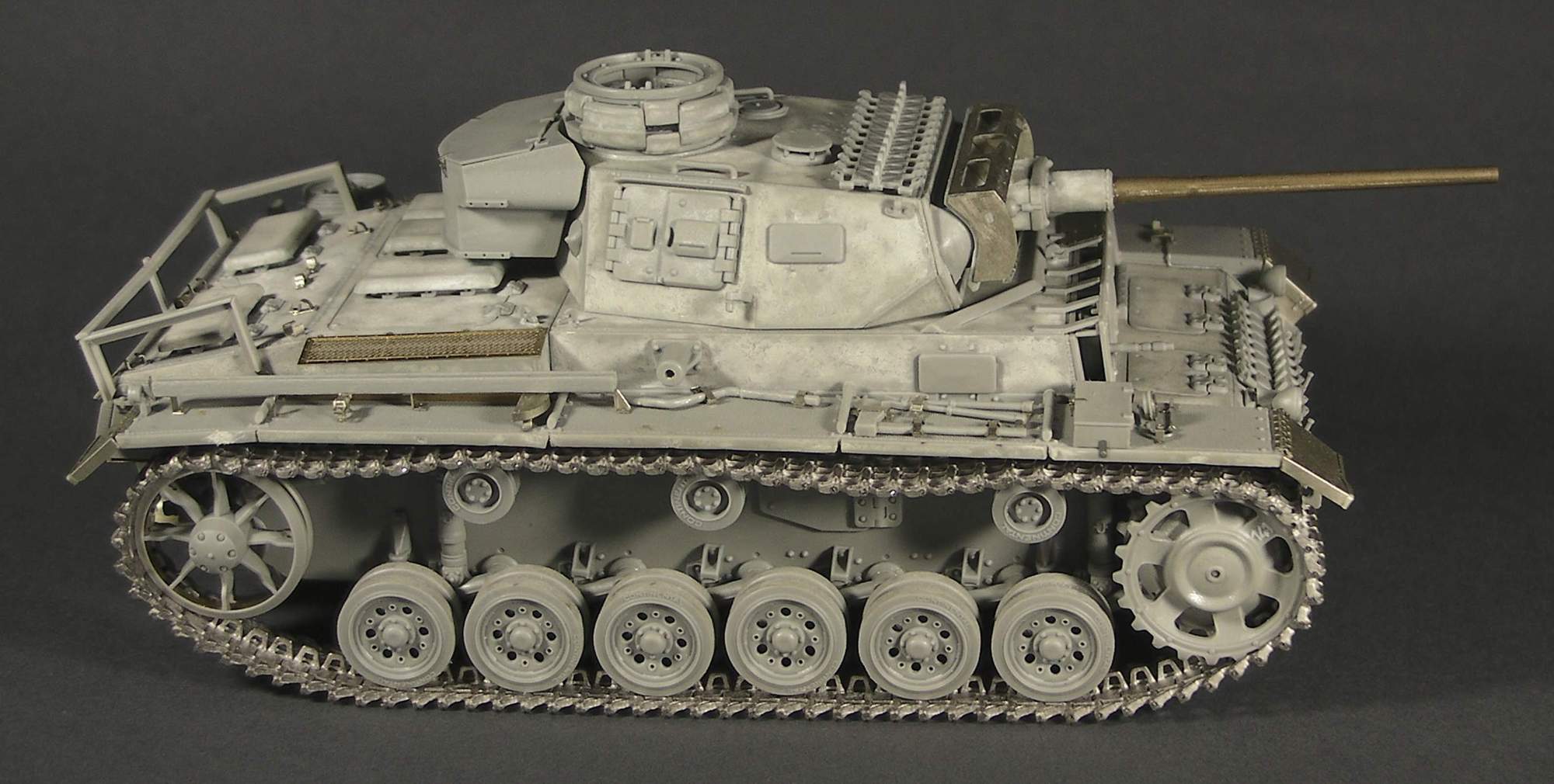 рабочие поверхности у покрышки скорее серые, чем черные. Боковая сторона протектора темнее, чем рабочая. У Вас же они одного цвета. Грязь на рабочей поверхности, вообще-то, держаться не должна. Она же все время трется по дороге. А вот в углублениях протектора грязь будет. Попробуйте не только краской грязь иммитировать, используйте также пигменты либо пастель. Кроме того, учитывайте, что загрязняется не только покрышка, но и диск. Его тоже надо пачкать. Количество грязи на нем зависит от того, какой тип грязи хотите передать: мокрую и в большом количестве либо же подсохшую. Кроме того, смотрите, чтобы вид загрязнения колес и катков был одинаковым. Не может же машина ездить колесами по одной грязи, а катками по другой.
