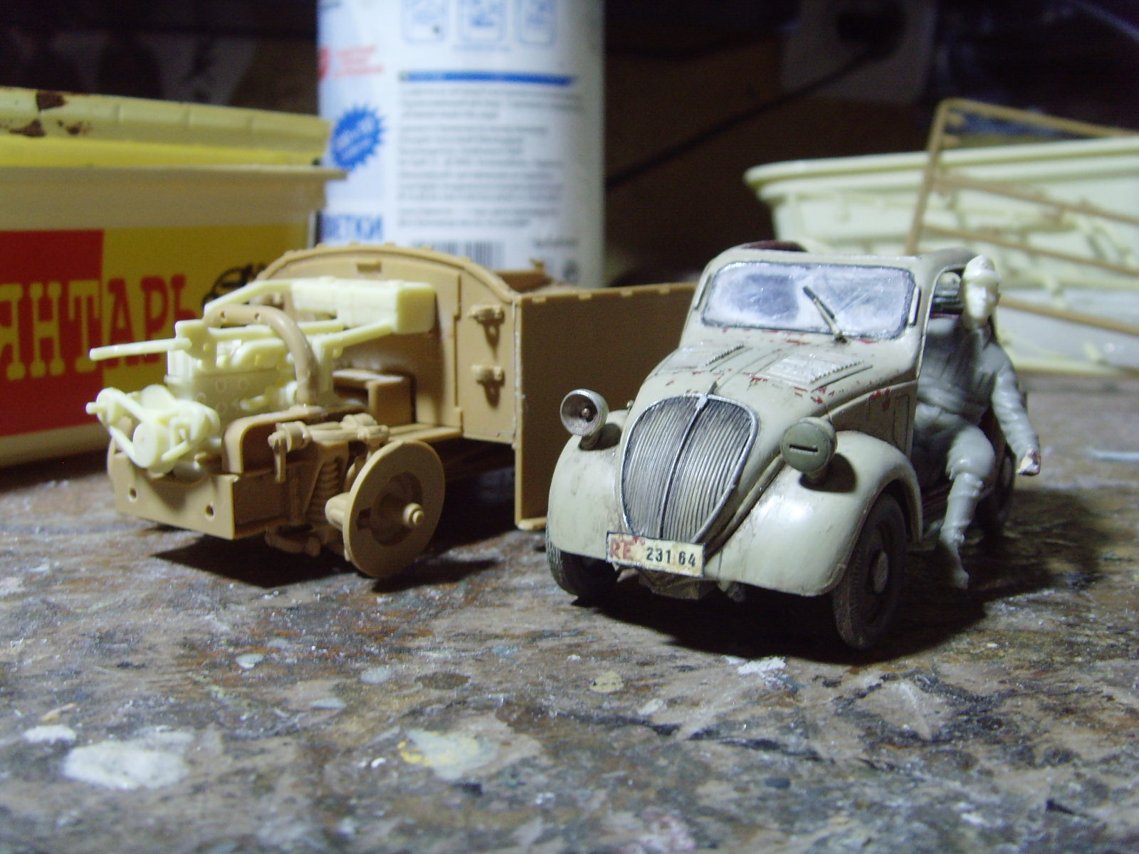 Вот итальянский "джип" FIAT 500 A - пиратка от Моделвиктории. Прикольный автомобильчик, использовавшийся доблестными итальянцами в качестве военного, похоже, от безисходности. Пиратская отливка не имела ни стёкол, ни декали, ни фотоэтчеда. Имелось много пузырей, из-за этого пришлось самому изготовить правый лонжерон рамы, пару поперечин, кардан. Также изготовлены дворник, стёкла, рычаги коробки и стояночного тормоза, номера, зеркало, козырьки..