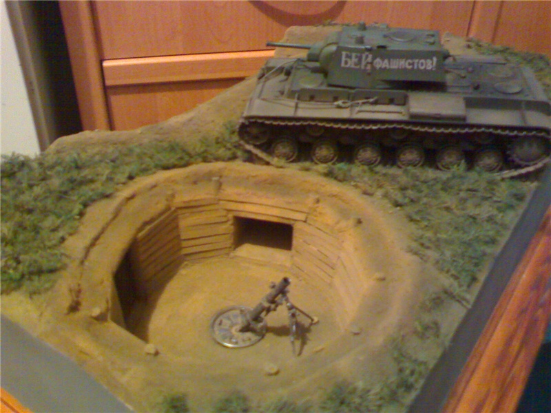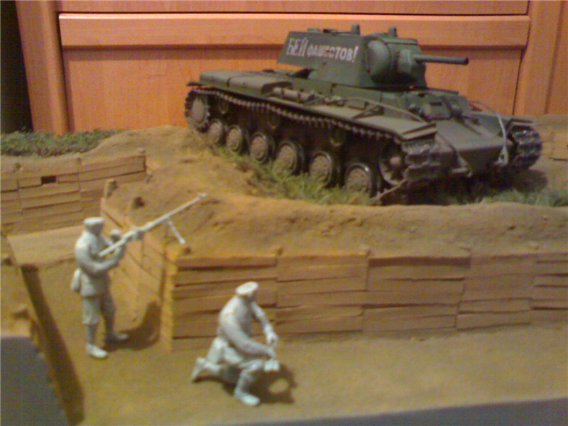 вот потихоньку делаю, в связи с этим вопрос танк уже перед окопом, стоит ли ставить бойца с противотанковы м ружьем на диораму?или хватит одного с связкой гранат? P.S.кроме них солдаты еще будут, и извиняюсь за качество фото, хорошие фото будут по окончанию работы