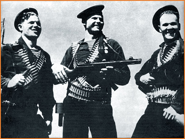А бойцы на верхнем фото, вероятнее всего из отряда Куникова (с сентября 1943 на его базе сформирован 393-й батальон МП), по крайне мере на других фото этой серии известно конкретное имя баяниста, а он как раз Куниковец, погибнет в 44-м... с миной тральщик с морпехами не разойдется.