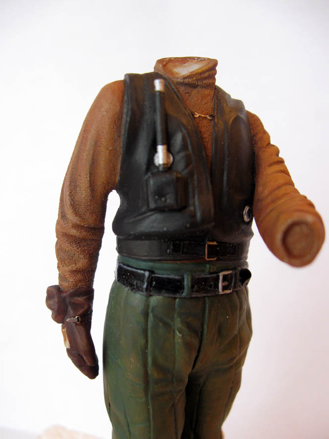 При работе над верхней частью фигурки столкнулся с ремнем Мёбиуса. То есть ремешок есть, но у него нет ни начала ни конца. Ещё раз посмотрел на рисунок по которому лепилась фигурка- на коробке и рисунке Дармана- он есть, а скульптор пренебрёг этой мелочью... Вырезал из фольги конец ремешка и приклеил.