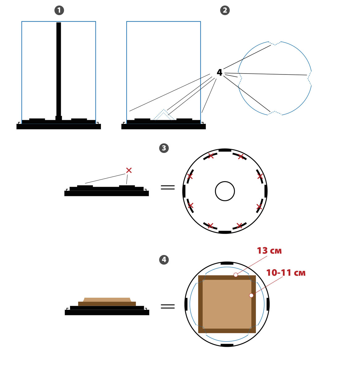 2)Внутренняя вертикальная осевая держалка у меня откручивалась (удобно). Потом- делаем аккуратно четыре треугольных выреза в пластиковой прозрачной крышке (крест- накрест). Высоту выреза- смотрим и вычисляем по имеющейся у ВАС подставке. (Макетный нож).