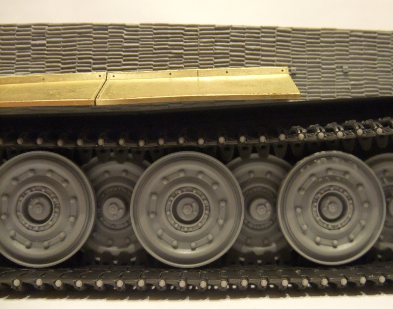 DW, "Вояджеровские" подкрылки начинайте ставить от краев к центру,чтобы они у вас дугой не выгибались,как видно на снимке( сам ставил,знаю),они немного не в размер и нужно подтачивать опорные части на которых крепяться подкрылки.Тогда они становяться в ровень с корпусом танка.
