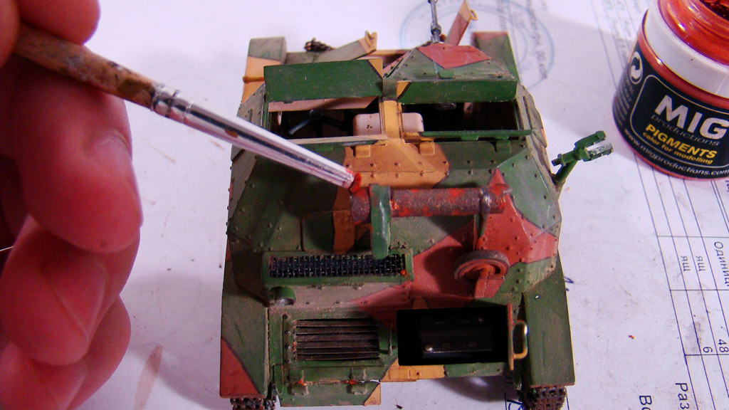 После нанесения грязи,можно даже не дожидаясь пока она засохнет, вся ходовая обильно обрабатывается пигментами от мига P414 Track Brown, а все остальное светлым P232 DRY MUD