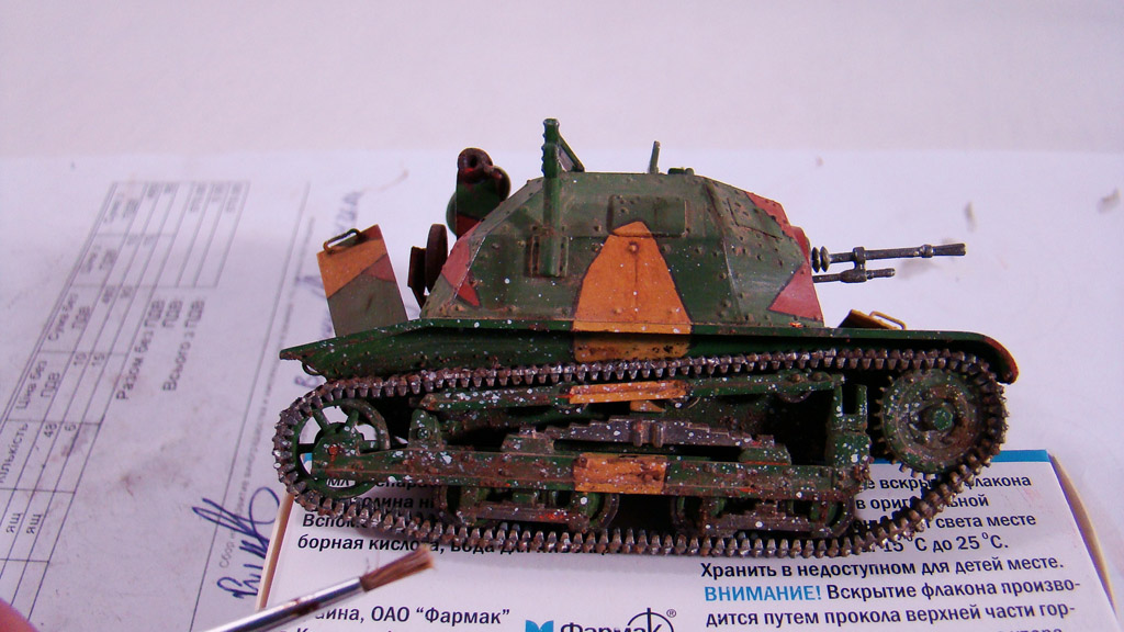 И наконец низ корпуса был забрызган 3 цветами LIGHT FLESH-VAL 70928 , SS CAMOUFLAGE MEDIUM-VAL 70826 ,SS CAMOUFLAGE BLACK-VAL 70822.Брызгать лучше синтетической более жесткой кистью.Желательно тоже не новой.