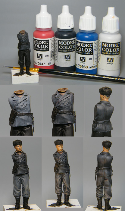 Дмитрий Шишков, При росписи фигурок обычно пользуемся системой: кладем базу, а оттенки для теней делаем постепенно из базы с добавлением более темной краски, база добавляется каждый раз являясь, своеобразным связующим звеном между основным цветом лица и тенями, так же поступаем и с выступающими гранями постепенно выводя базу до разумного предела более светлой краской. Такое ощущение что в какой-то момент работы базовый цвет как связующее звено не применялся при смешивании краски для теней или высветлений. Но если над лицом фигурки еще будет проводиться работа, то возможно я просто придрался к незаконченному варианту.