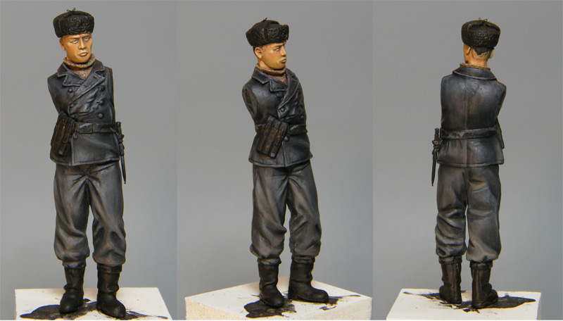 Дмитрий Шишков, Есть выход! Бушлат кажется кожанкой т.к. высветляете чисто серым цветом,что придает ощущение блеска, попробуйте вместо белого цвета добавлять для высветлений песочный. Я думаю при росписи штанов вы так и делали.