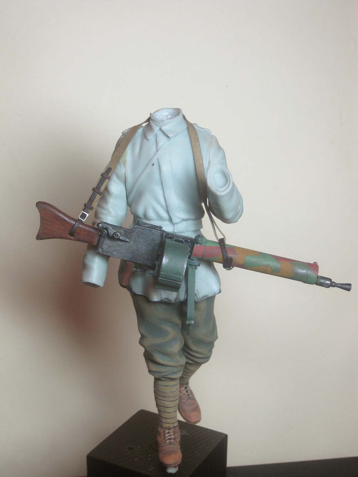 Здорово получается. А вот есть док. фото пулемета в камуфляже ? Музейный образец пулемета с камо стволом видел. И случаем закомуфлированный бачок и ящик не времен ли фрайкорпса ?