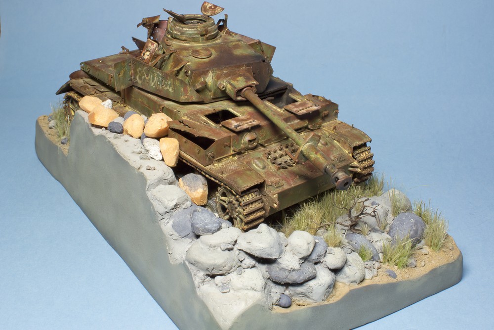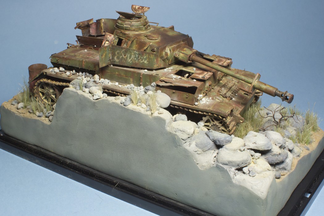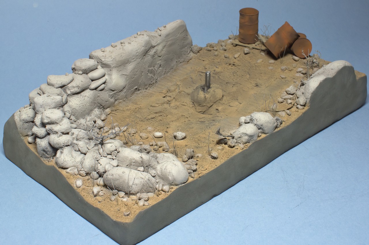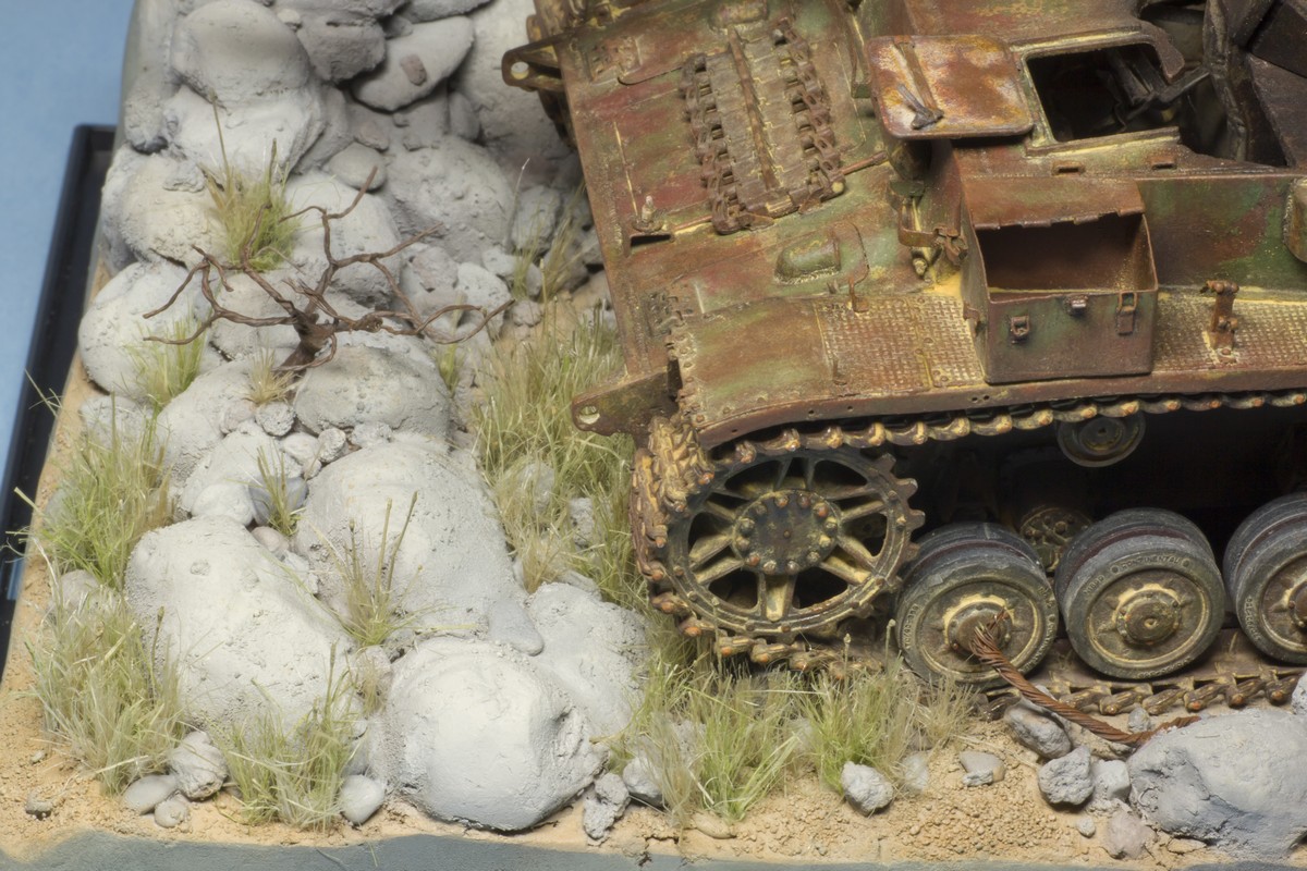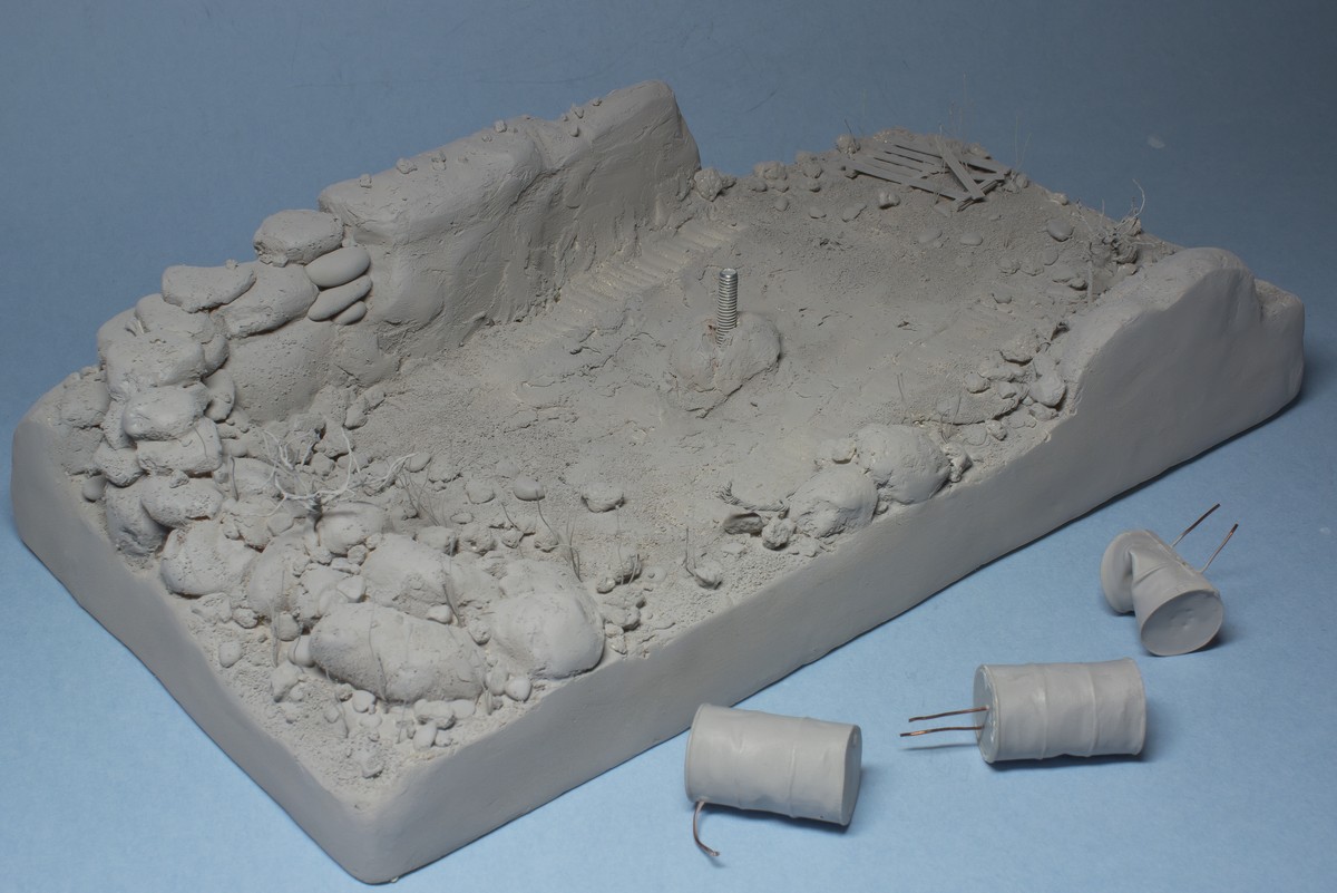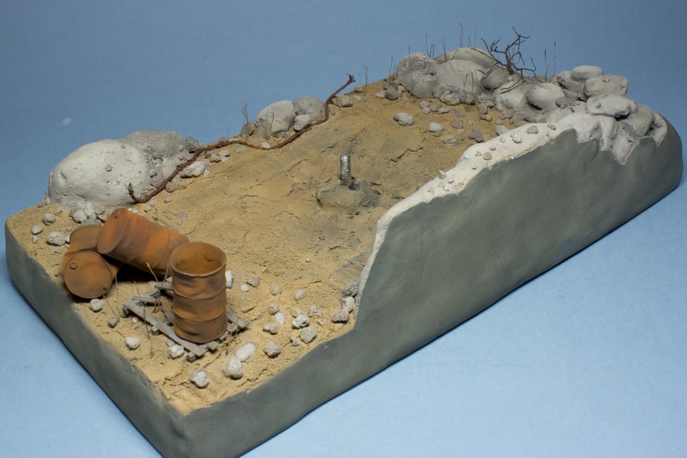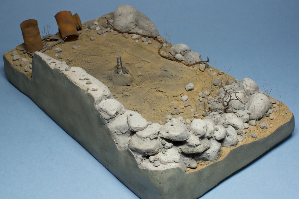 Ну и вся подставка перед нанесением лака. Докрасил кистью все поддувания от аэрографа, придал разнообразие оттенков камням. Покрасил кустик, трос, поддон.