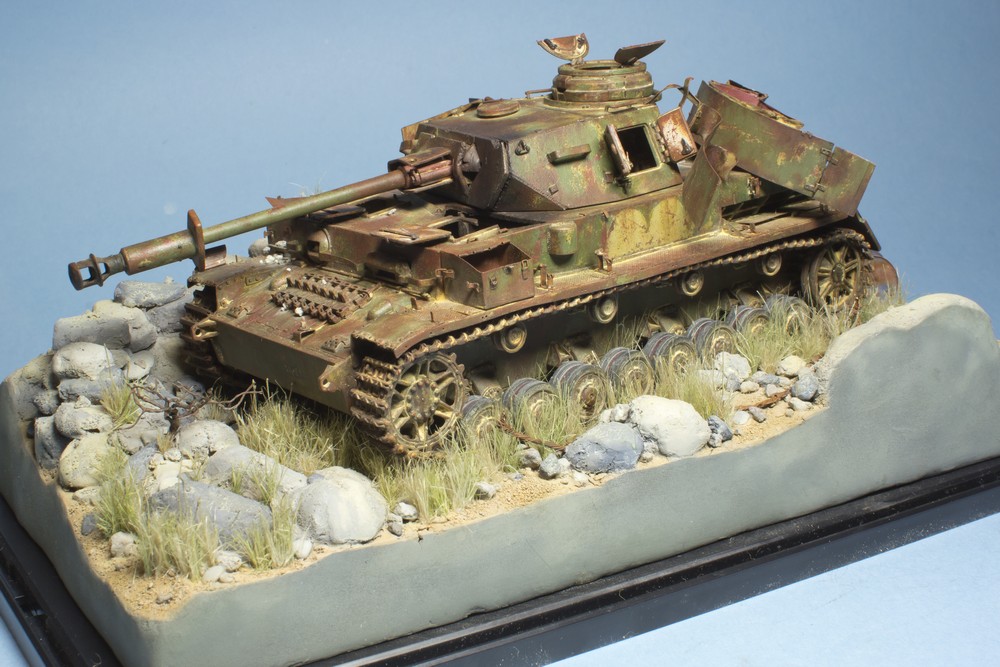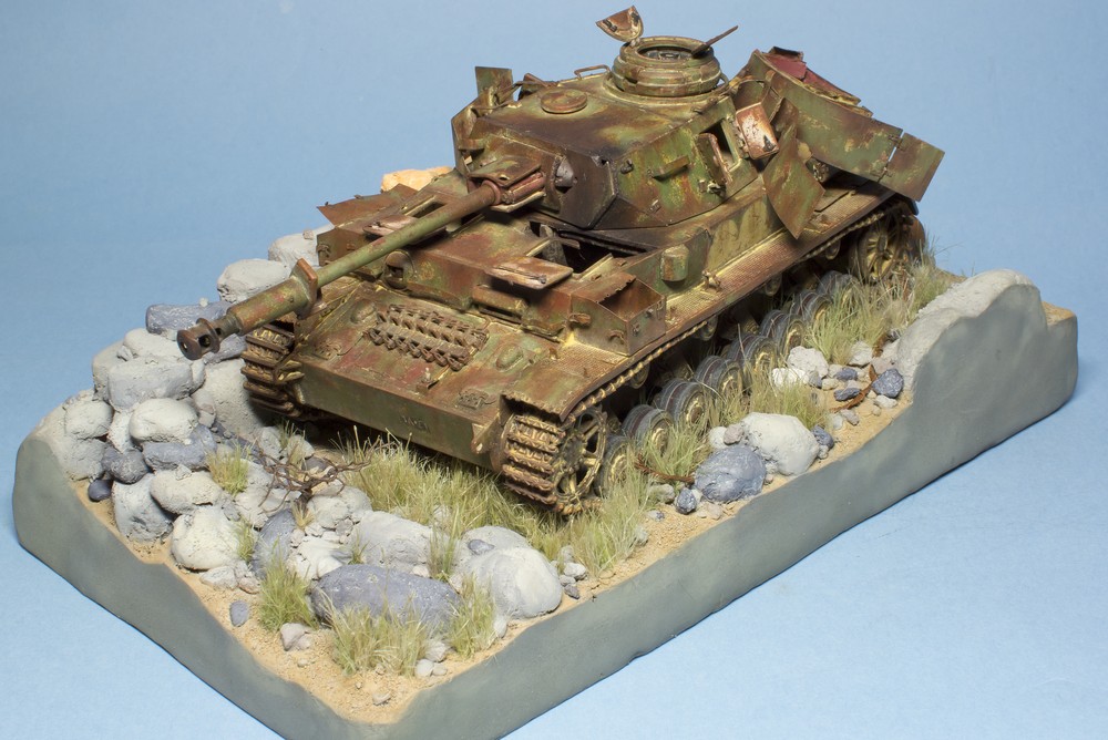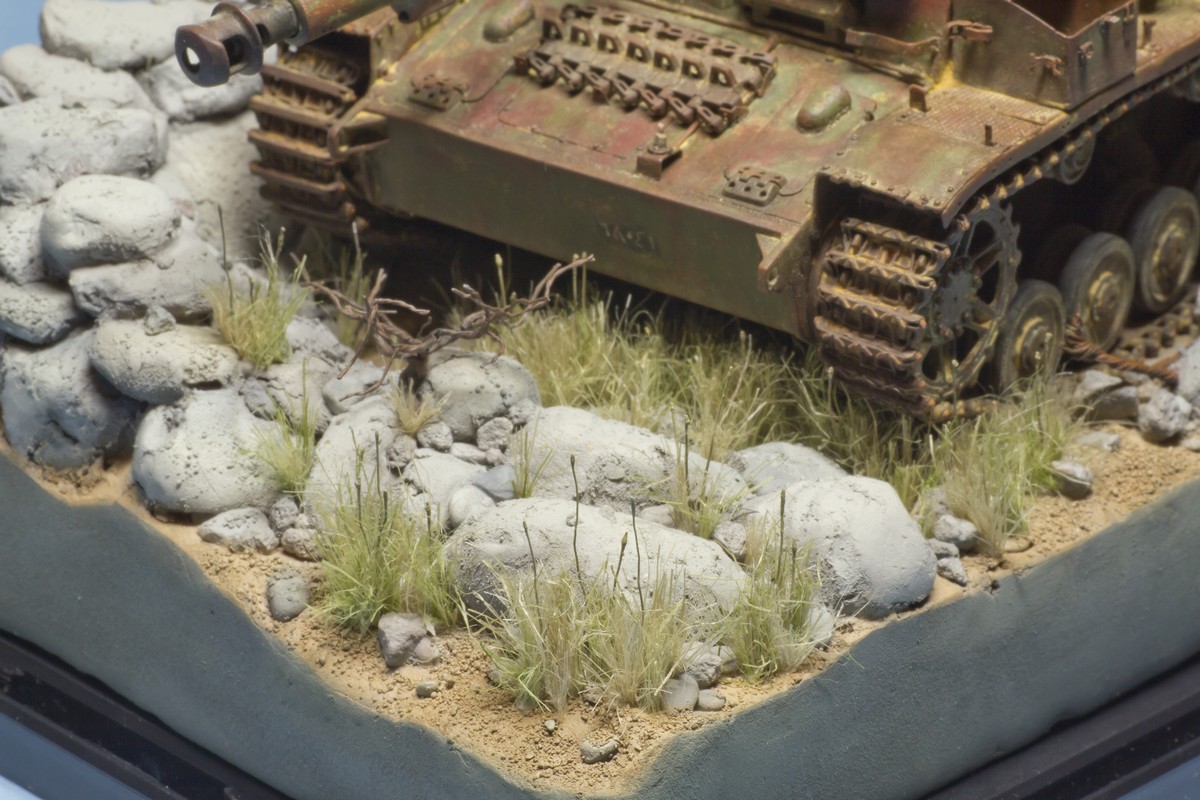 Начал высаживать траву – пока только в передней части. Танк уже прикручен к подставке, но засыпание гусениц и катков песком и камнями еще не начал - можно снять и поправить