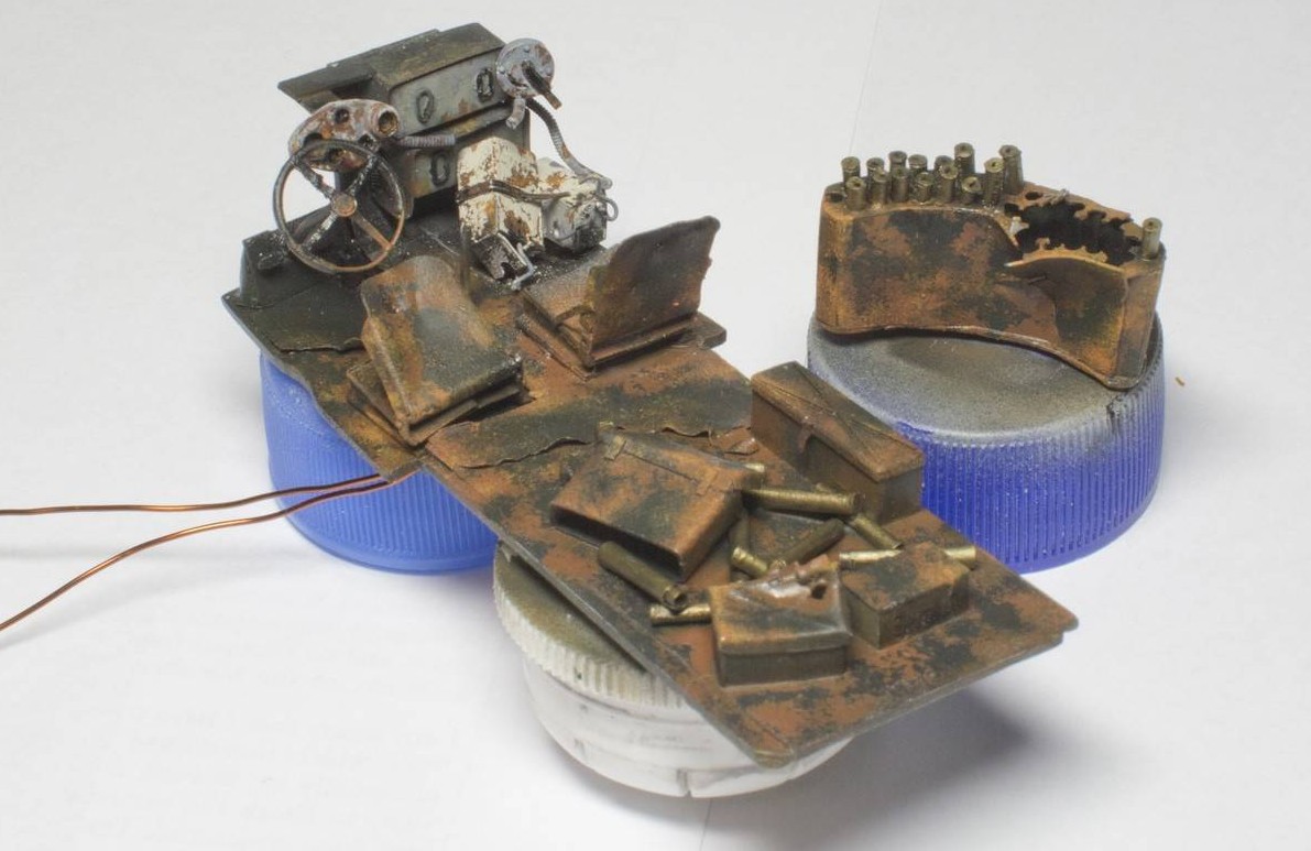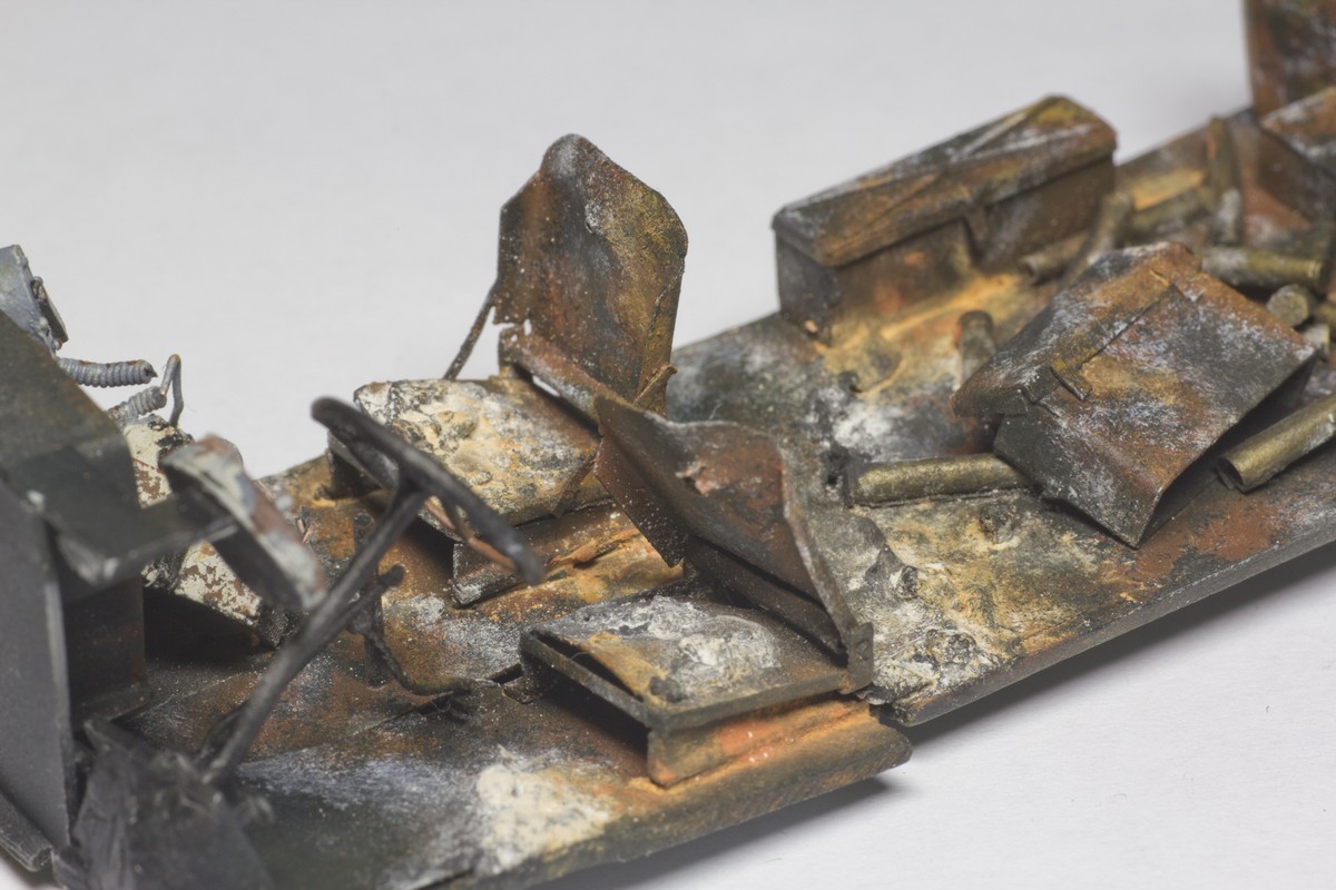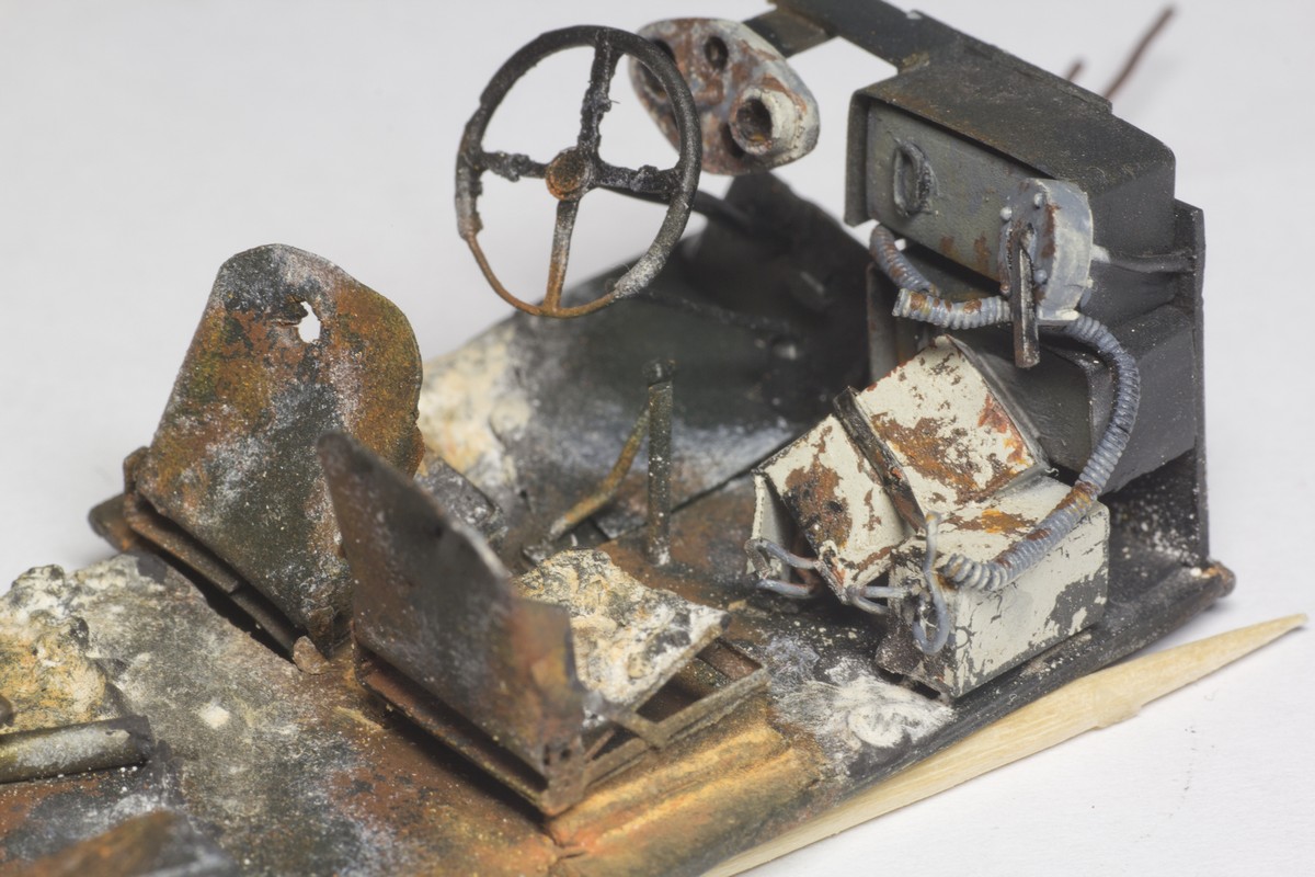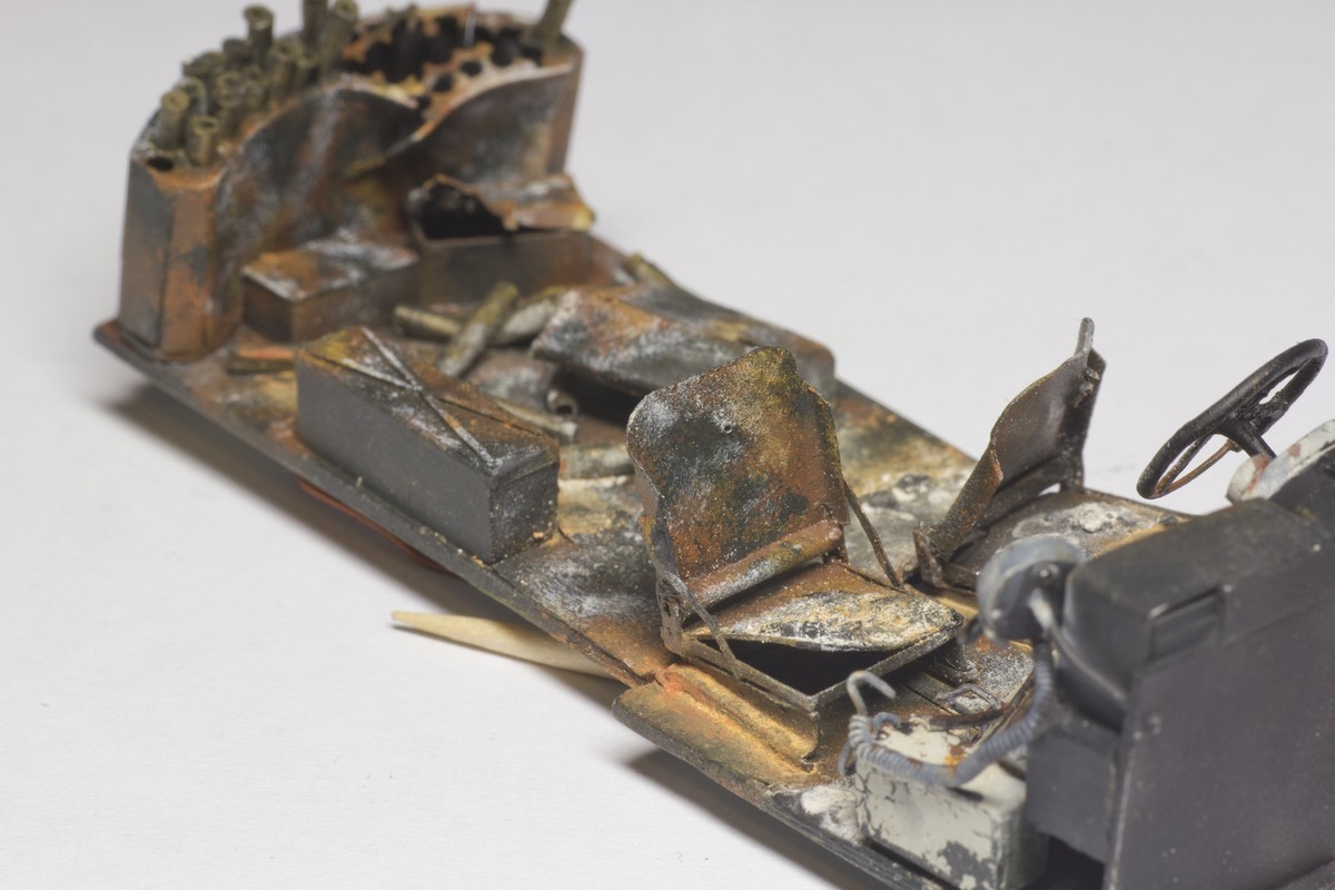 Jonny_ Bravo Проблема с яркими оттенками интерьера в том, что их там не было. Пол, колесные ниши, ящики ЗИП, все укладки, сиденья экипажа (в т.ч. и в башне) были покрашены в черный цвет. А стенки в белый. Вот и получается, что на черном трудно изобразить сгоревший металл, а на белом - пепел. Даже не знаю что там внутри может быть синего, красного или желтого.