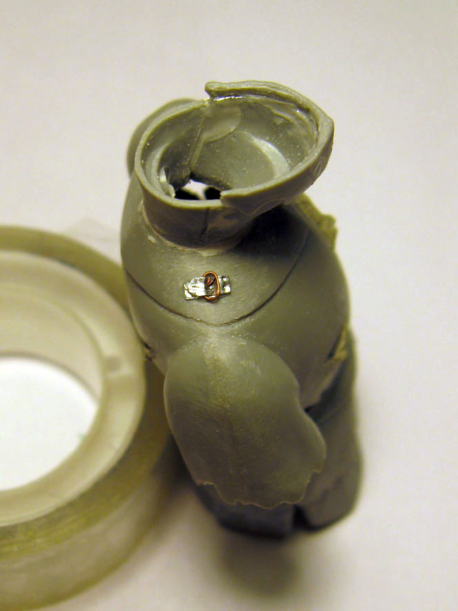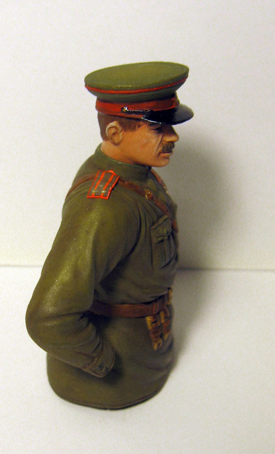Пришлось делать офицеру лоботомию- отпиливать верхнюю часть с волосиками. Хирург из меня тот ещё- вот я и промахнулся.Не беда- на помощь пришёл Эпоксилин- сваял голову без волос, лысую, но влезающую в фуражку. Для похожести персонажа- сделал усы.