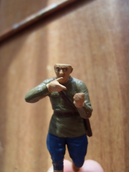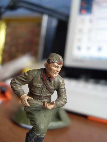 Всем привет! Пытаюсь сделать советчких пехотинца и офицера от MasterBox. Пока получается не очень(( Пехотинец покрашен полгода назад, офицер - несколько прошедших дней. Крашу акрилом Tamiya. Впервые пытался делать тонировку лессировками жидко разведенной темной краской, но возникла проблема - при нанесении полупрозрачного слоя при отрыве кисти от поверхности краска собирается в каплю в месте отрыва и слой получается неравномерным, соотв выглядит ужасно. Поэтому делал так: в базовый цвет добавлял по чуть-чуть темный цвет и прорисовывал все более глубокие складки. Так же пока для меня составляет проблему правильно расположить тени на лице, но над этим работаю. В общем, конструктивные советы приветствуются)[/img]