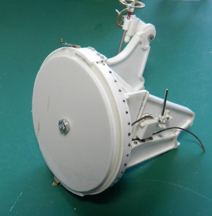 Сделал из пластиковой трубки лоток для подачи снаряда. Установил его колёсики внутри рамы и приклеил к осям сам лоток. На площадке приклеил станины с блоками и установил кран на кронштейнах в боевом положении.Потихоньку стал строить тумбу под лрудие.