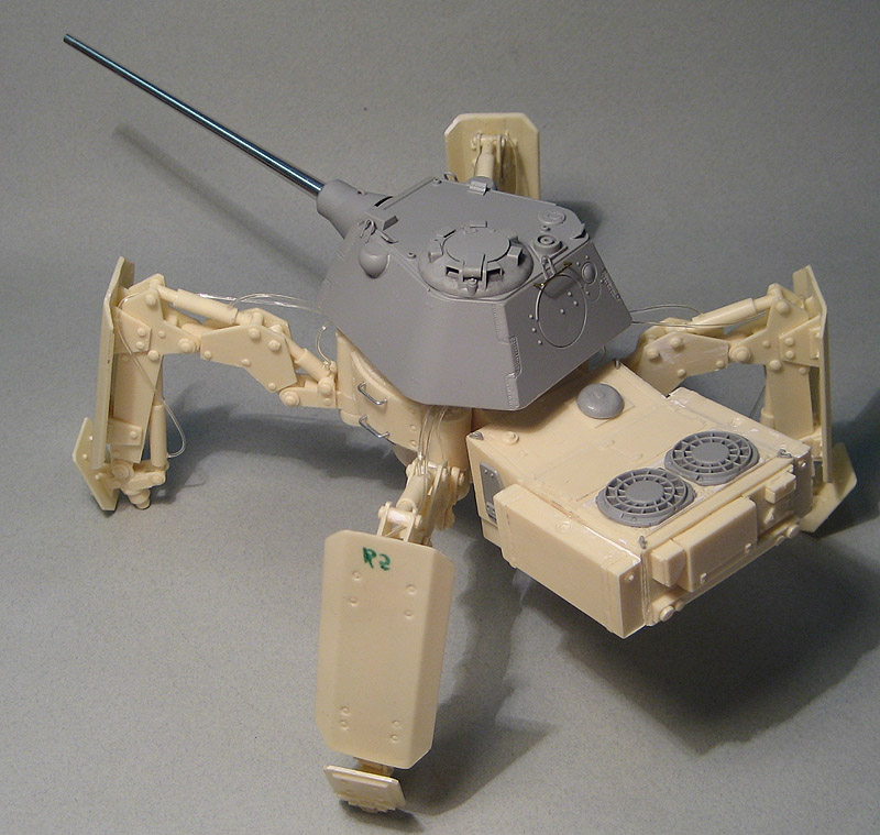 Продолжаю работу над Шагоходом. На модель была установлена башня (Выбрал оную от Пантеры Ф). Кроме того, приклеил разную мелочевку, чтобы германизировать модель: решетки вентиляции, люки, шаровая пулемета, смотровой прибор мехвода.