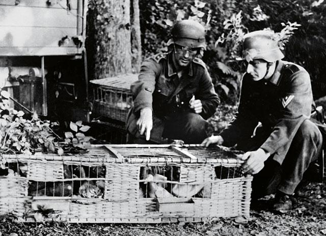 Сергей, добрый вечер! Позвольте несколько слов по вашей фотографии. Клетка эта не составная, и уж тем более не из 4 частей, а просто двухуровневая. Перегородки-то вертикальной не видно. Также в пользу этого говорит то, что дверцы всего 2, а не 4. Кроме того, распорки на шарнире по бокам говорят о том, что клетка складывающаяся, и боковые стенки у нее, по-видимому, из ткани. На это указывает их некоторая вогнутость, малая толщина и фактура, схожая с фактурой мундира. Обратите внимание также на решетчатую стенку. Она состоит из двух рамок - верхней и нижней, соединенных широкими скобами-петлями, следовательно, складывается пополам. Сверху конструкция прикреплена петлями к твердой верхней стенке, значит тоже складывается параллельно ей. Внизу же, крепление идет только за счет стяжного ремня, что еще раз говорит в пользу того, что конструкция складная и довольно легкая. Какая там задняя стенка, сказать трудно, может быть и решетка и тряпка. В пользу тряпки говорит то, что через решетку на спину солдату будет лететь птичье дерьмо, не думаю, чтобы в педантичной немецкой армии начала ВМВ сознательно допускали это. Хотя, решетка дает лучшую вентиляцию, да и складывается конструкция лучше, чем с прибитой тканью. Так что, вопрос. Крепление ремней, наверное, аналогично ранцевому, по крайней мере, это было бы логично для армии.