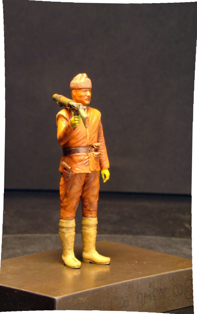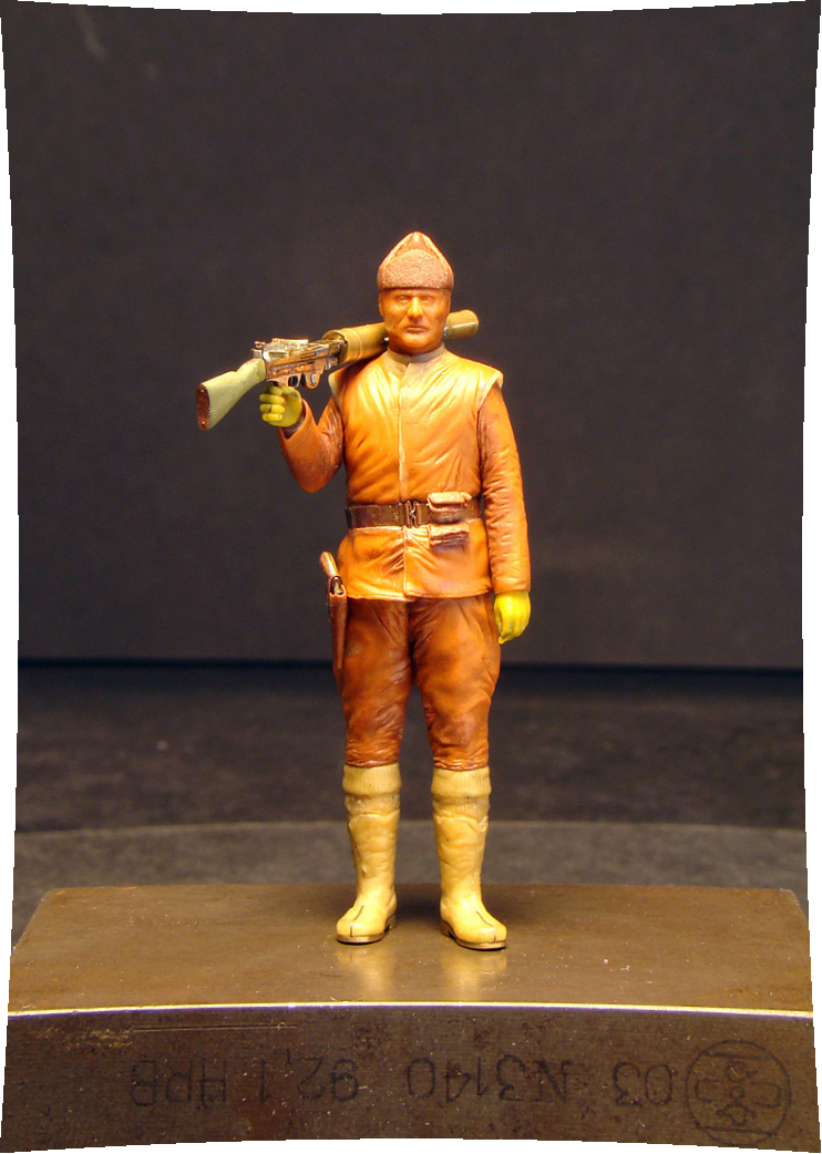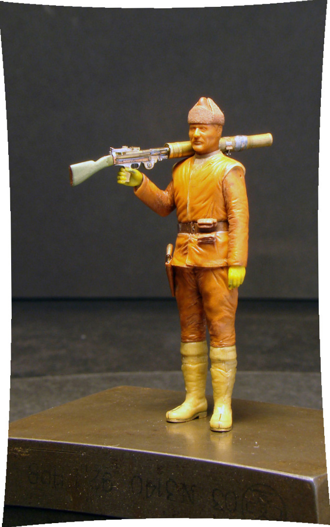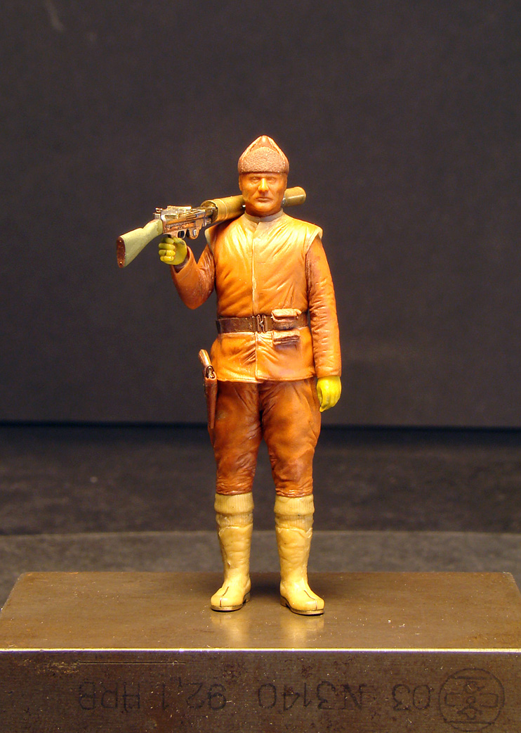 Igmar, ИМХО человек который держит (наверняка!) тяжелый пулемет должен стоять в другой позе.Наверное-опираясь на левую,а правая чуть согнута.А он у вас как часовой.Ну это мое субъективное мнение.Еще раз повторюсь фигурка очень хорошая.