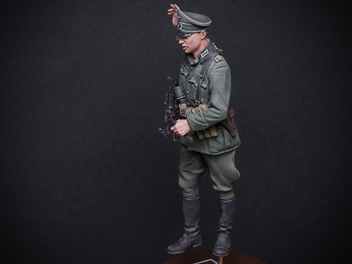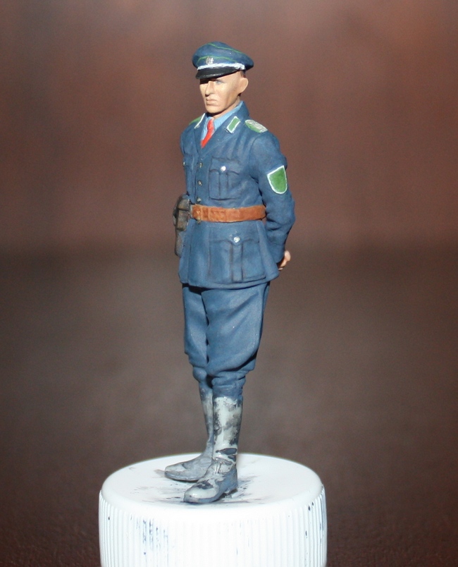 . Впрочем, наверное, всё же, чуть по-пачкаю одёжу. Михаил, насчёт кисти Вы правы - уже переклеил её, придав более естественное положение. С ремнём на шее действительно заморачиваться не хочу, т.к. естественно облегать ворот он всё равно не будет и закроет при этом офицерские петлицы (а этого очень не хочется). Там на другой стороне ремня висит не второй подсумок, а полевая сумка - вот на ней, как раз, и оказалась рукоятка "автомата".