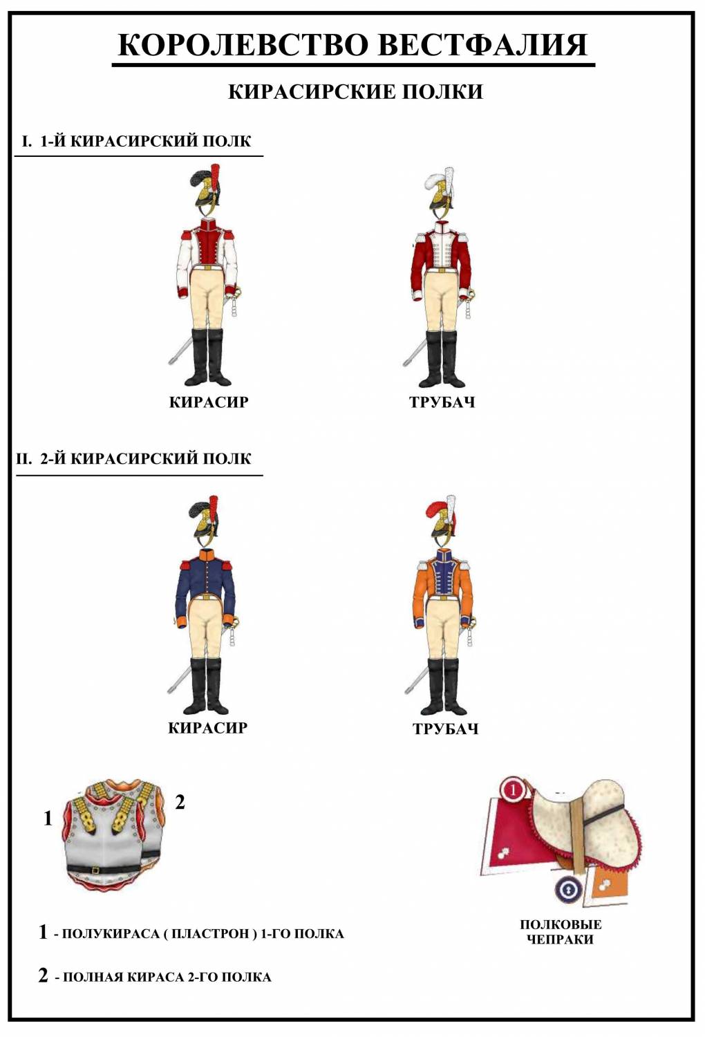 Кирасирские полки в 1809-1812 гг: кирасир(а), трубач первого полка (б),