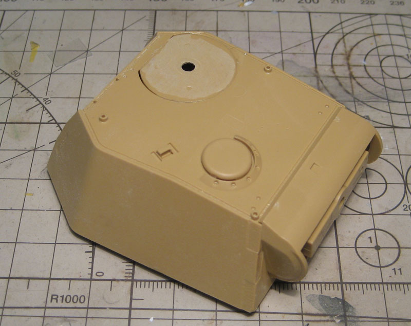 Также поработал и над башней. Снова столкнулся с недоработкой сотрудников СМК. Начал устанавливать створки люка, но обнаружилось, что они не совсем верно сделаны, если сравнить с фоткой крыши настоящего Эрзаца. В результате у люков были сточены ранты на внутренних сторонах, чтобы они просто лежали на башне не возвышаясь над ней. Также доработал шарниры люков. Они были не совсем верны.