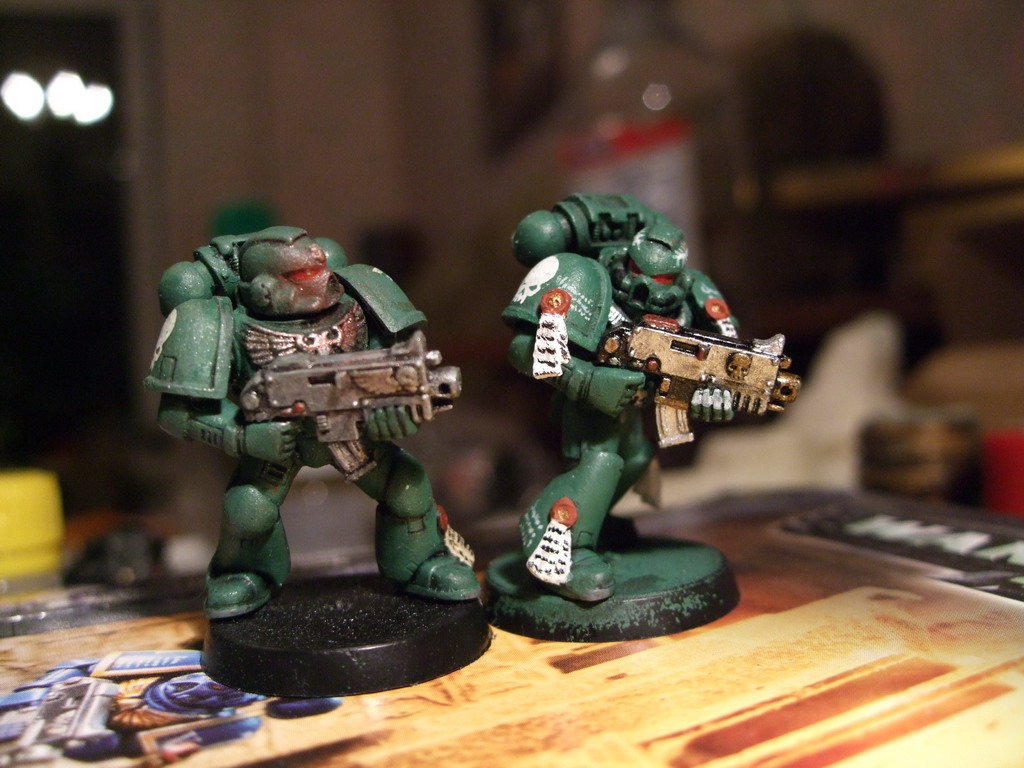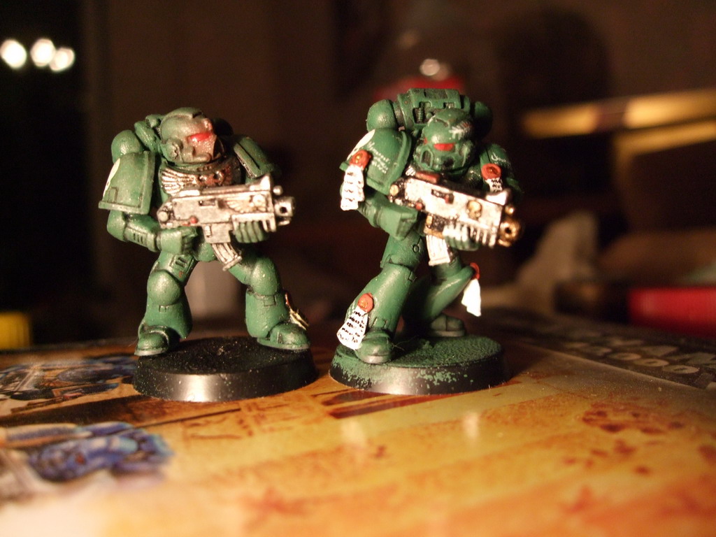 Вот собсно, решил себя попробовать себя на наборе из 5 космодесантников Space marine Combat Squad. Фигуры не впечатлили, но кой-чо выгрызти из облоя удалось.Красил humbrolom, аканом, тамией, короче всем, что попалось под руку.Прошу оч строго не судить тк это мои первые(и, скорее всего, последние) фигуры по вахе.Приму любую критику