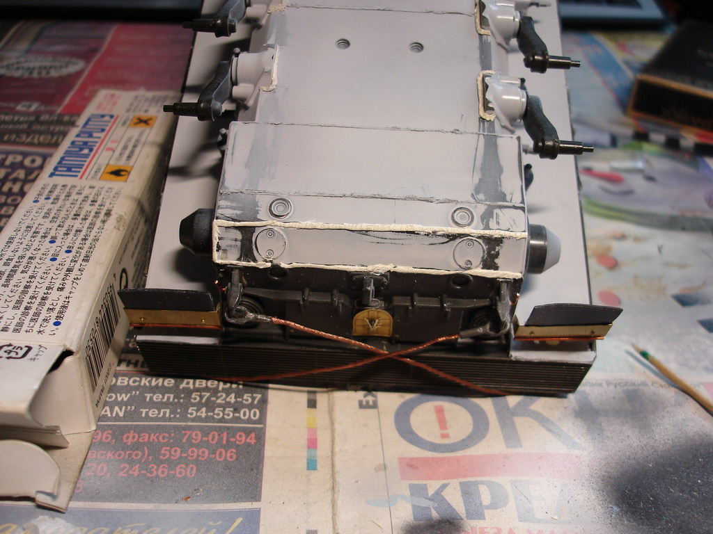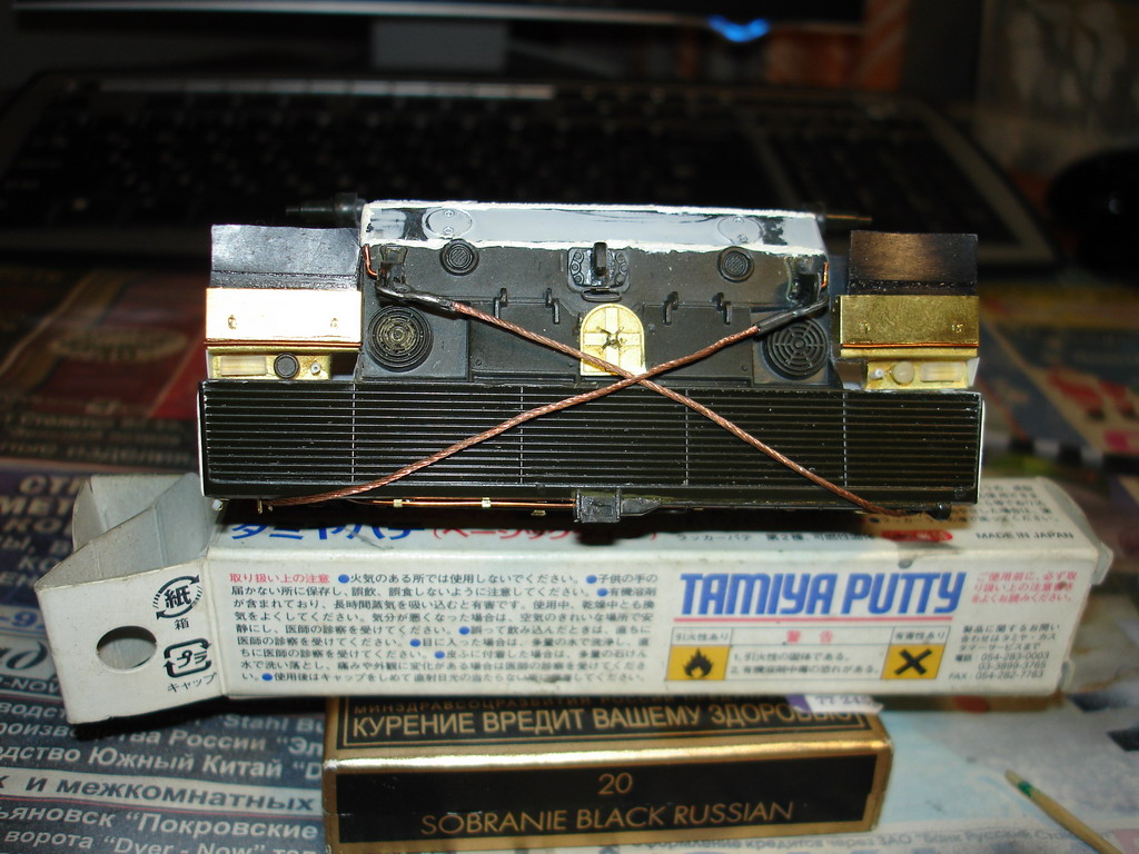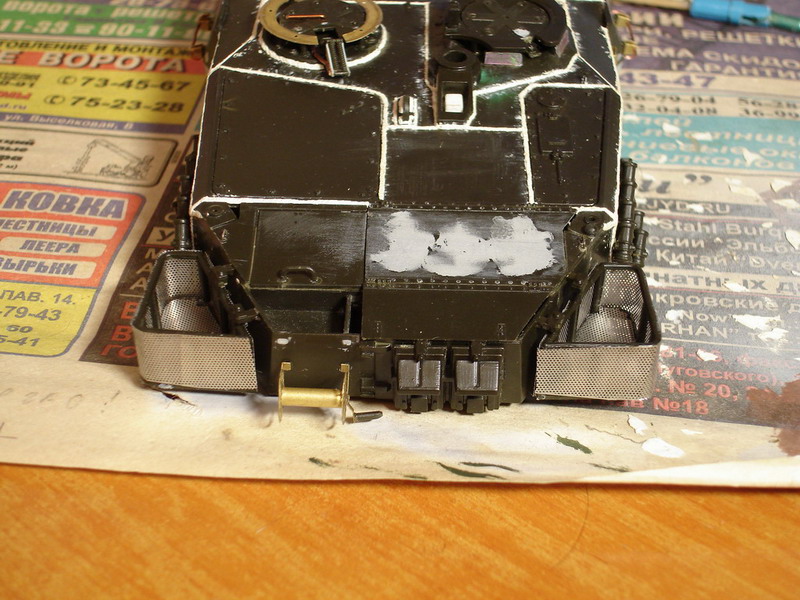 Сделал дымовые гранатометы, корзины, катушку для кабеля, "приварил" демонтажные петли, установил пушку, поручни и по мелочам. Не хватило у меня характера спаять новые корзины (эти немного неверны), в итоге подгонял тамиевское травло под италовский пластик, задние стенки оказались все таки кривоваты, грунтану - посмотрю как это будет выглядеть в монотоне, возможно переделаю. Ну собсно башня практически готова, осталась пара мелкий деталей, с турелью пока не решил что делать. дальше все упирается в засохший колорстоп, перископы нечем замаскировать перед грунтовкой и нанесением антислипа, заказал уже)) Пока идет посылка с колорстопом, тамийским скотчем и кой какими болтиками, некоторые места ещё подшпаклюю да переделаю некоторые швы на корпусе, да и "кошку" пора делать уже под окраску. ^_^