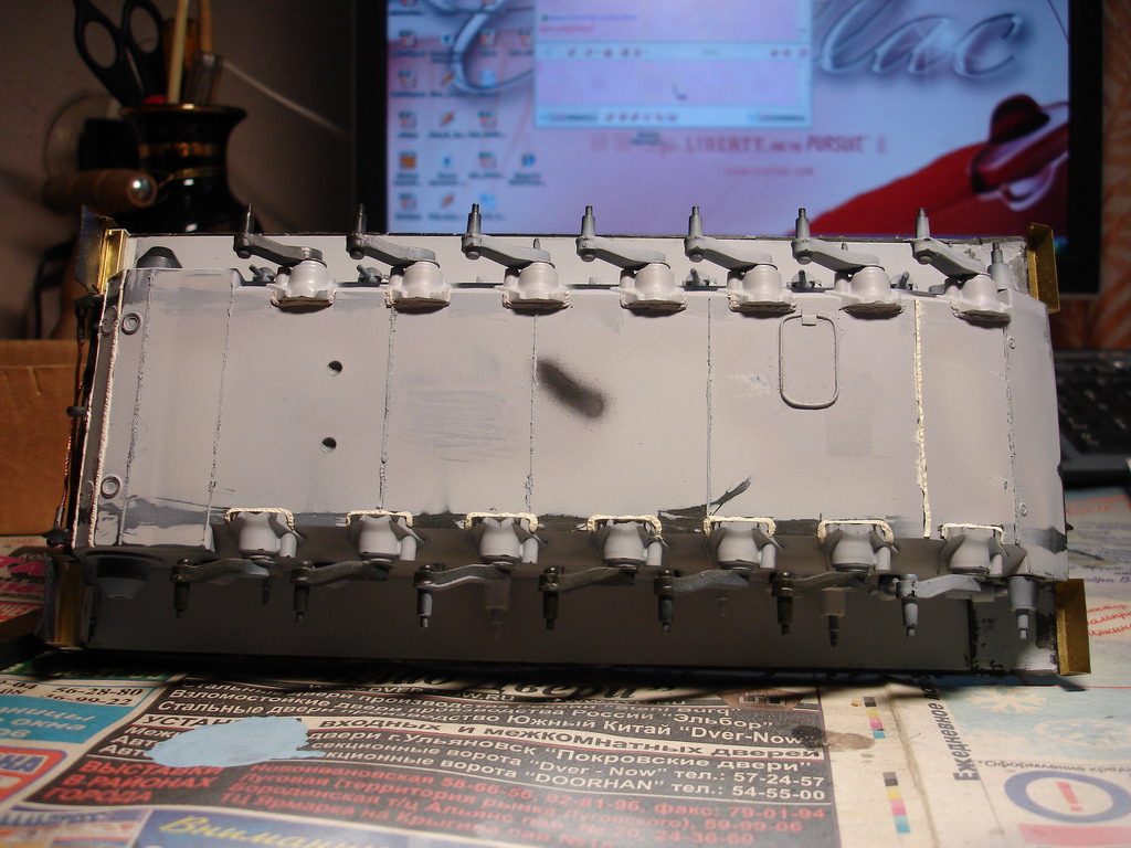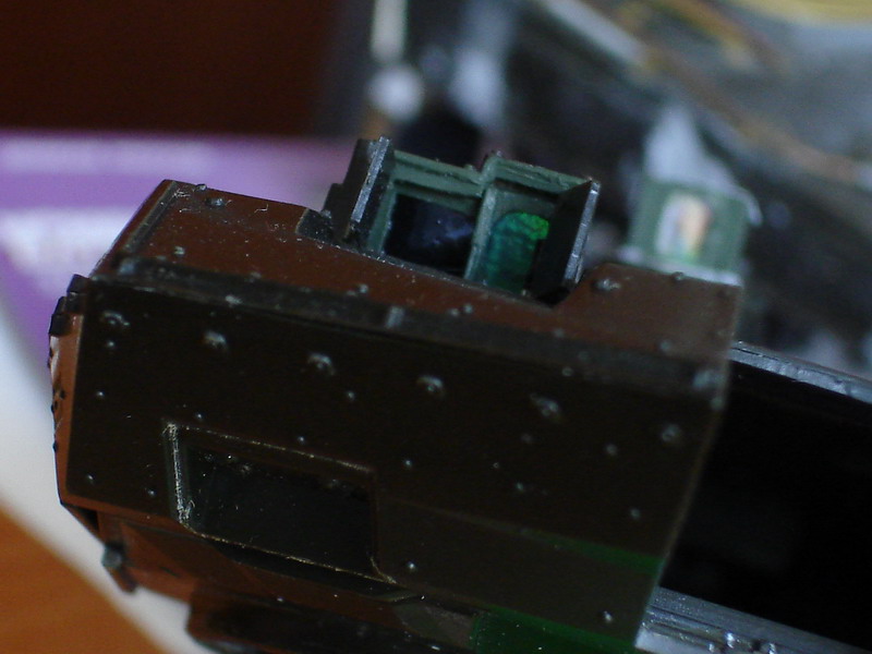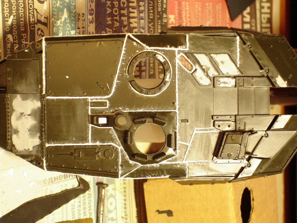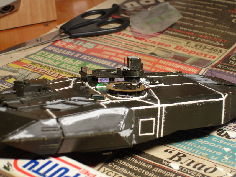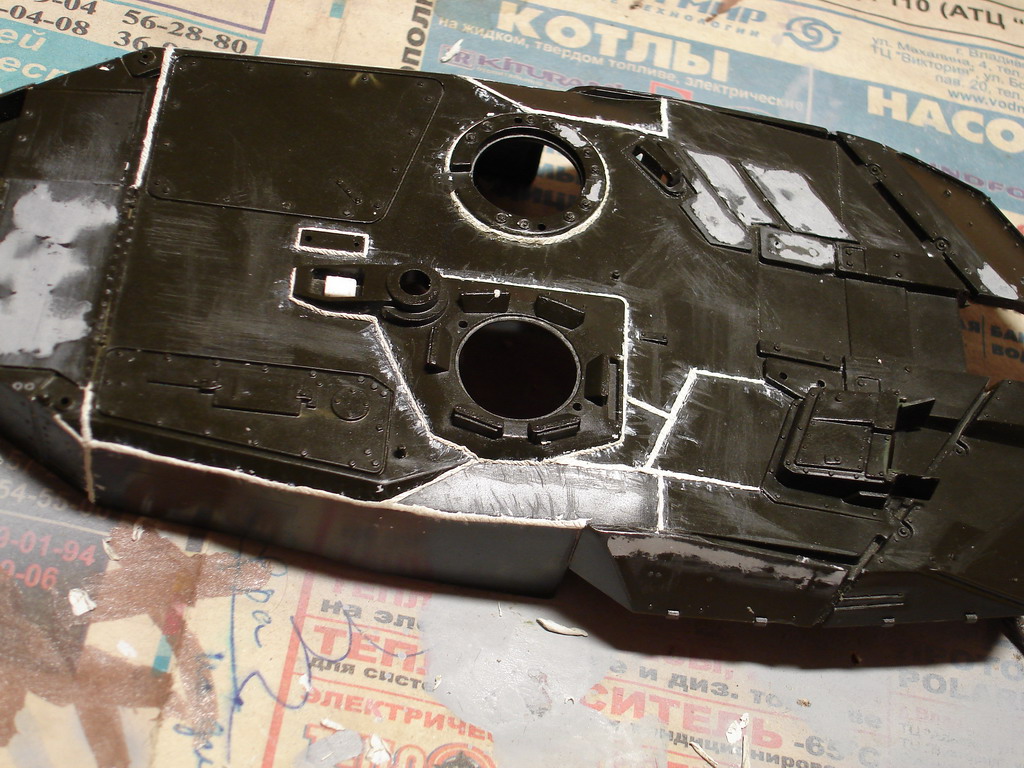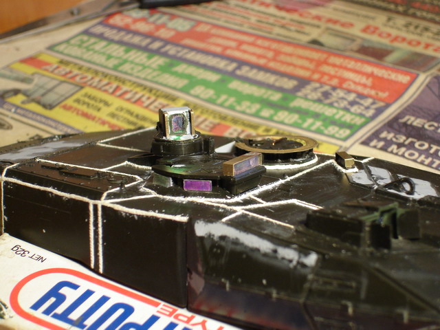 За вечер переделал в очередной раз швы на башне до приемлемого вида, это финальный вариант. На макро повылазили косяки, поправил. Юзал штатив, мировая штука! Куча утяжин замазана и зашкурена, в барбет вставлен раскроеный вафелькой кубик - имтитация радиатора тепловизора.