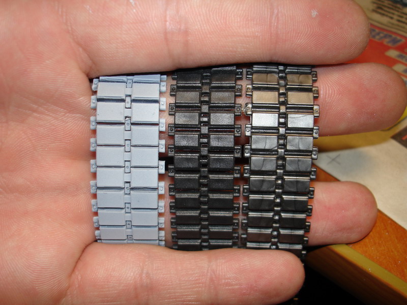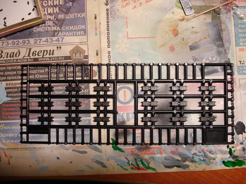 Добралсо таки до фотика, гусеницы отснял, для сравнения два сэмпла разного винила, черный - итал, серебристый - ревелл. Комментарии, я думаю, излишни, разницу видно невооруженным глазом))) На удивление - гусеница облегла идеально звездочку, почему при первой попытке она не легла - так и не понял... Воткнул 10 траков со шпорами - престраховался, что не хватит, несколько сломались, возможно потерялись, в итоге целых осталось ровно 10, столько же ,сколько поставил со Х-шпорами, ирония судьбы. Около пяти сломанных, два прикручены к морде, короче запас в этом наборе порядка 20 штук, башмаки так же с удовольствием теряются и с ещё большим ломаются... Получилось по 83 трака на одну ленту внатяг, провисами на леопардах и не пахнет.