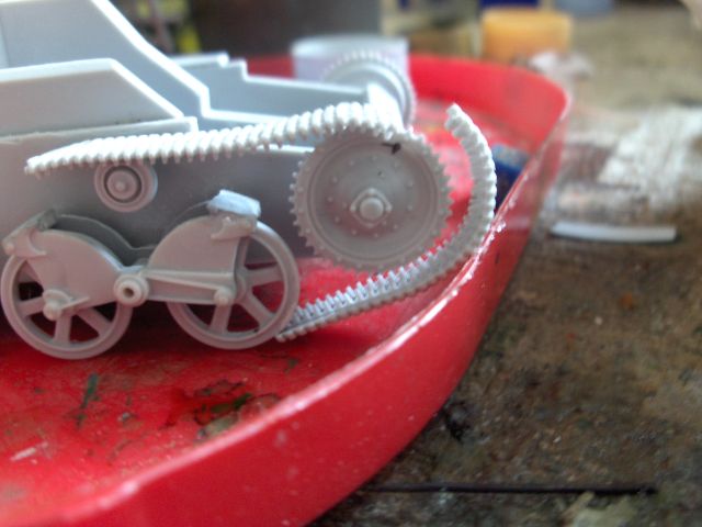 Ну, немного гусениц. Весь процесс показывать смысла нет, выложу когда сделаю. Лучше положить отрезки гусениц в горячую воду перед гибкой. Аккуратно с гребнями! Советую для точности стыковки частей гусениц пользоваться чем-то вроде несмываемого маркера для пометочек.