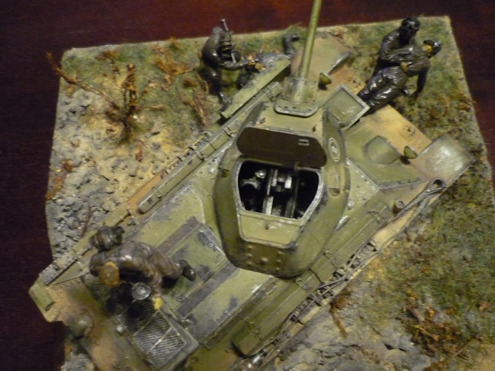 - полная перестановка фигур немцев и танкиста с пулеметом (он же не Рэмбо, чтобы так палить с моторного отсека!...перекочует за корму танка в той-же роли)