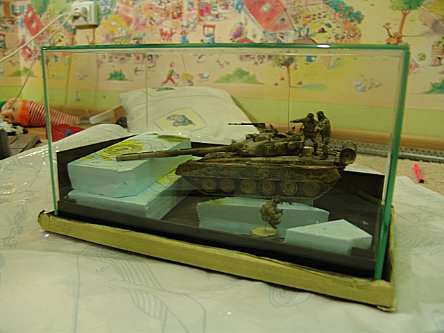 Под диораму есть основание под стеклянным колпаком.Все свои диорамы закрываю стеклом,и вам советую!Не дешево,но плюсы на лицо.Всё закрыто от пыли и шаловливых рук зрителей