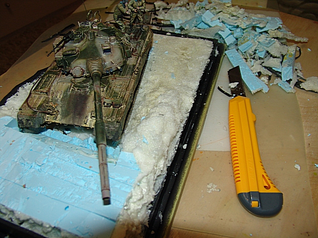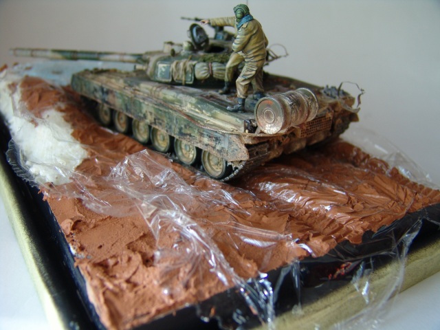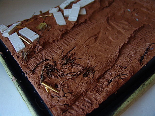 Я это делал строительной шпаклевкой. Наносил на твердое основание (бортик только надо сделать),главное чтобы не текла. Накатывал колеи, впихивал в грязь ящики,доски, раздавленные бочки, да что угодно можно. Позиционировал фигуры, технику. Впрочем, существует много способов сделать такую грязь. Можно Поиск поюзать, там по-моему было.